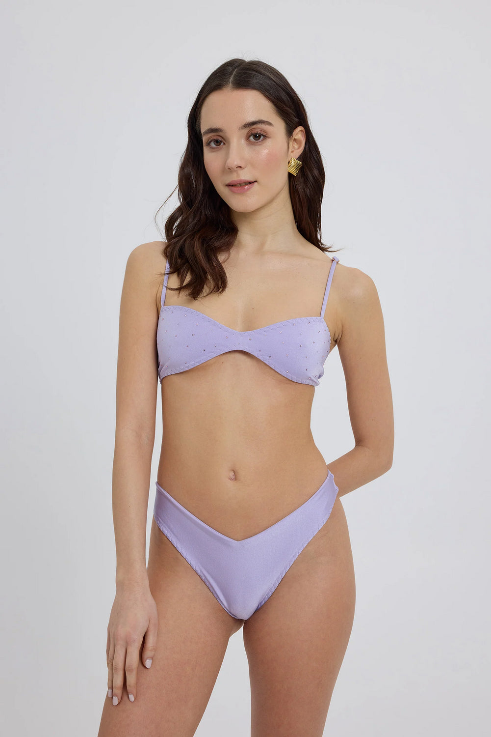 Top de cobertura media con forma alargada y ajustable, con costuras reforzadas en los bordes y finas tiras para anudar, permitiendo un ajuste personalizado. Detalle de cristales.