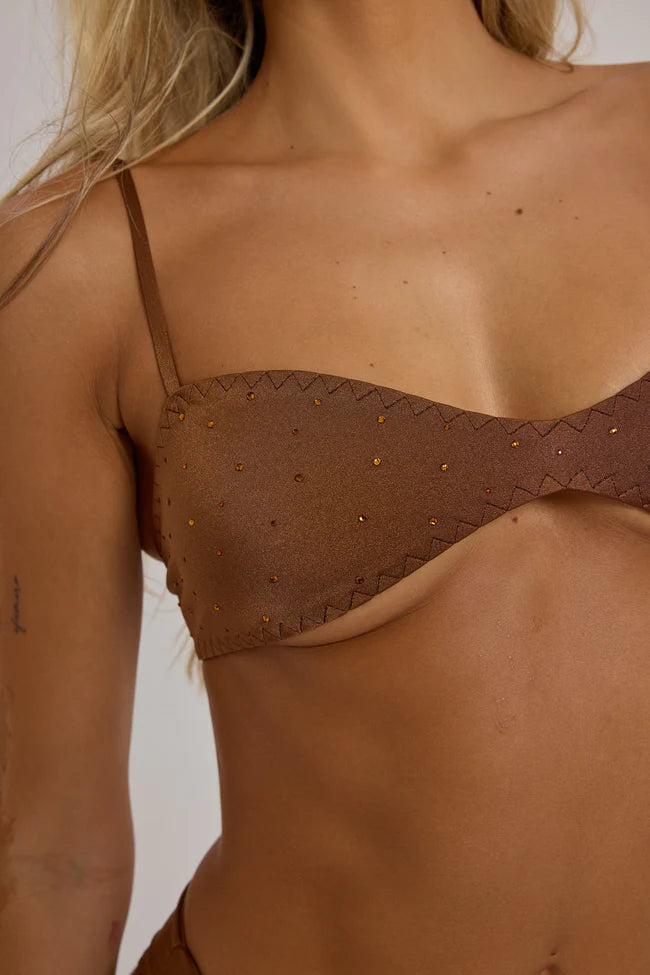 Top de cobertura media con forma alargada y ajustable, con costuras reforzadas en los bordes y finas tiras para anudar, permitiendo un ajuste personalizado.