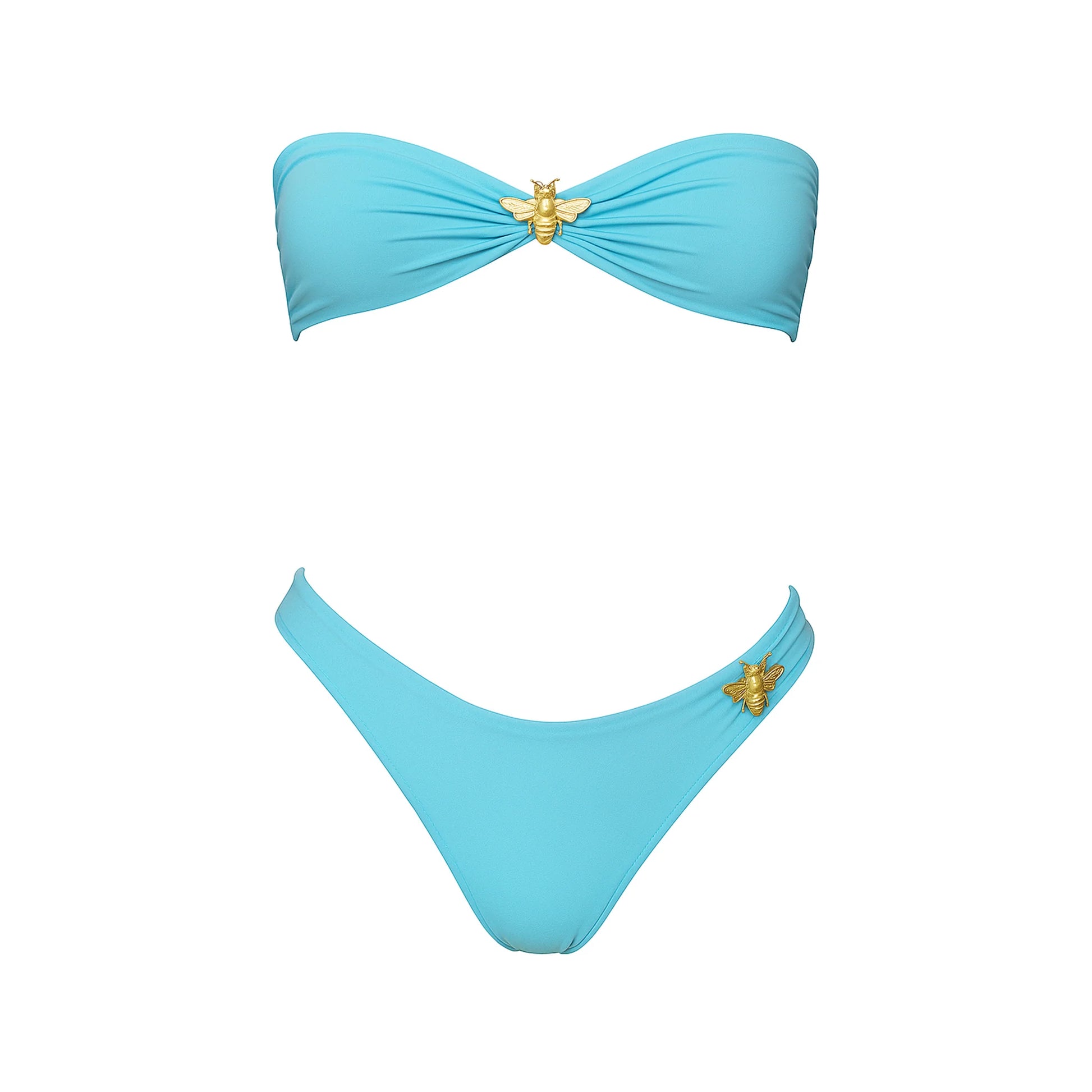 Nuestro top Carmen es un estilo bandeau con un toque especial. Luce un accesorio dorado en el centro. Se ata en la espalda para ajustarlo.