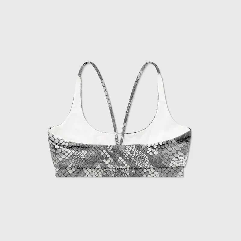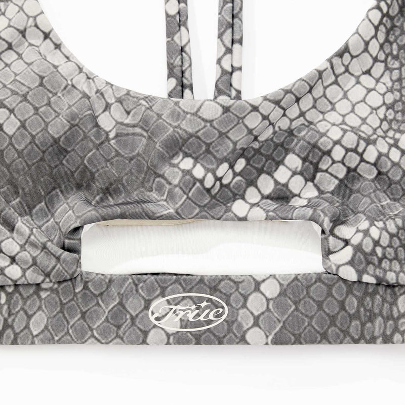 Top gris hecho en licra con diseño pitón sublimado en toda la prenda y una abertura adelante. El logo viene estampado adelante en vinilo textil. Tiene forro interno y cargaderas tipo V atrás.
