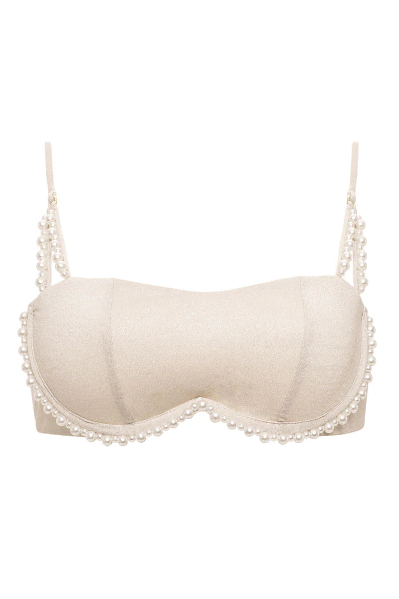 Vestido de baño, top beige con original silueta cuadrada con varillas que realza el busto de forma natural, con tiras de amarre ajustables en la espalda. Tela con pequeños destellos y con perlas que le dan un toque único a la prenda.