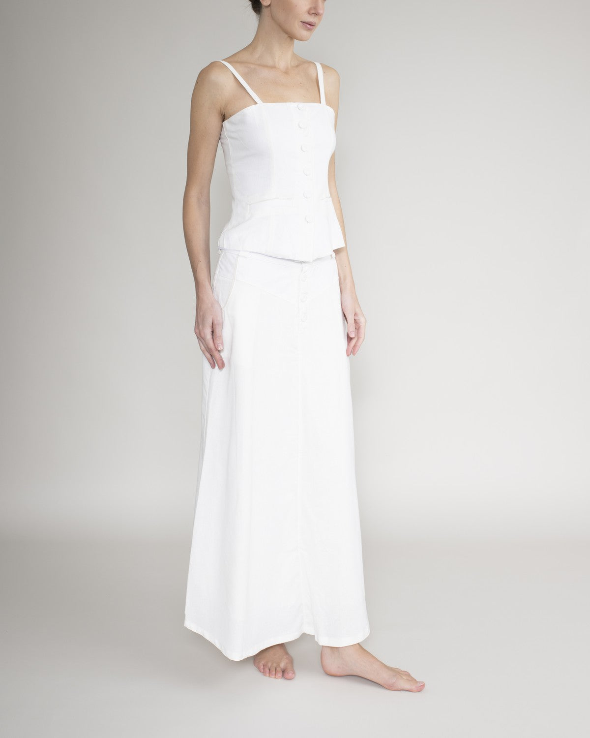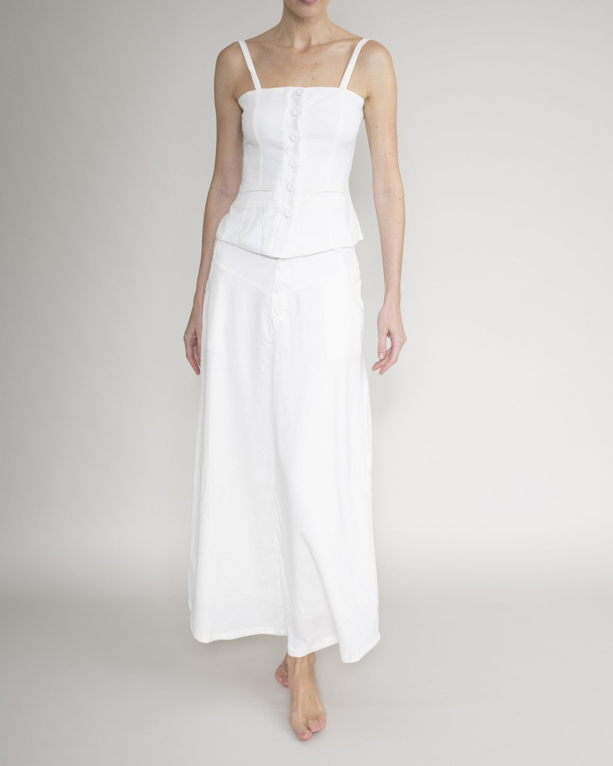 Top entallado estilo corsé con tirantes y detalles de botones decorativos.