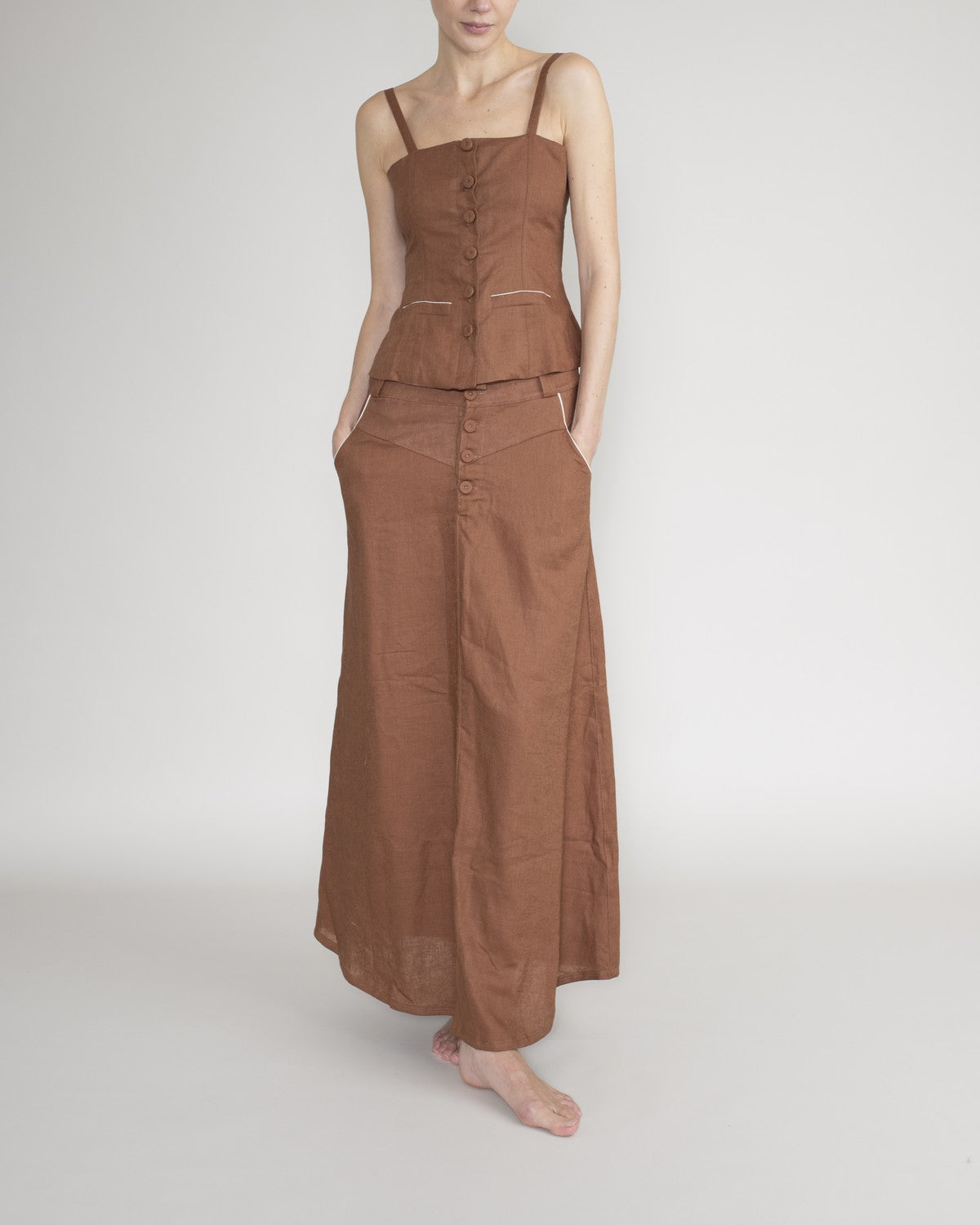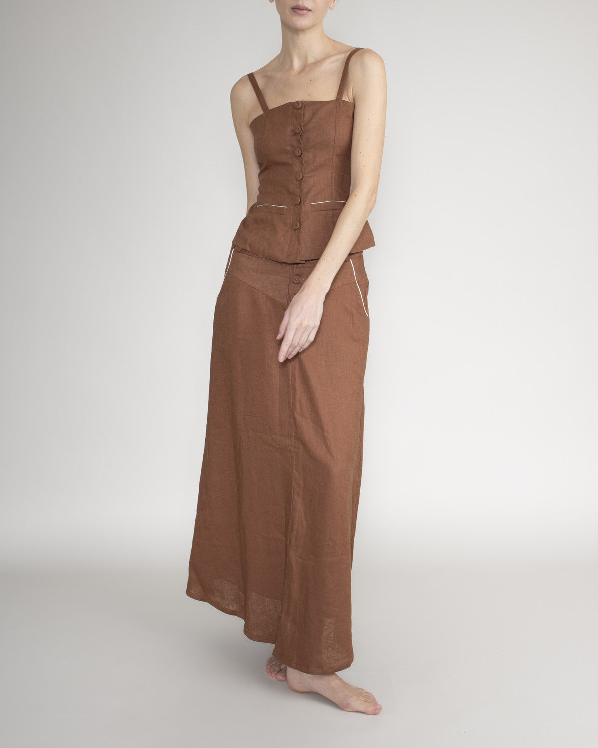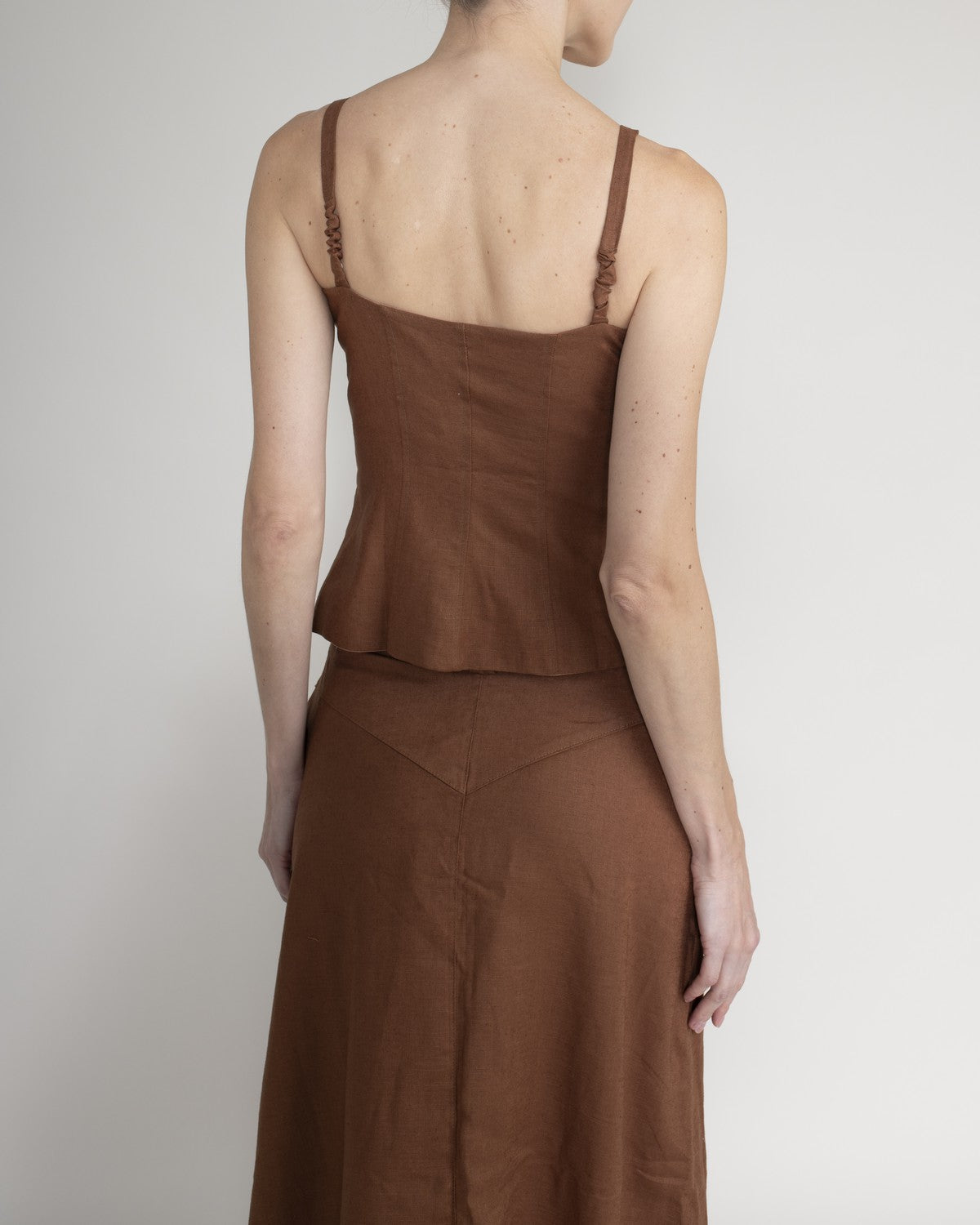 Top entallado estilo corsé con tirantes y detalles de botones decorativos.