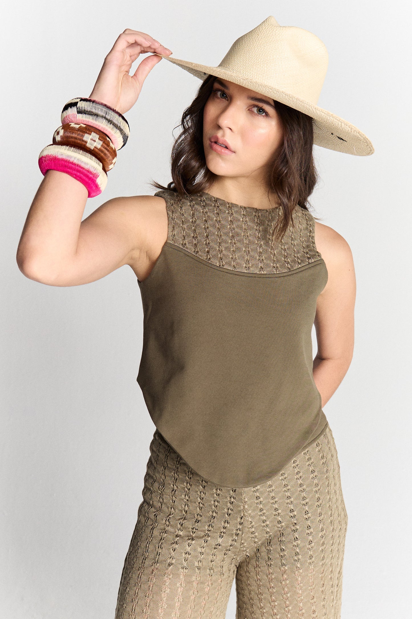 El Top Coralito combina dos telas especiales: una mezcla con rayón y una tela bordada suave que lo hace único. Tiene escote tipo halter y una silueta ondulada