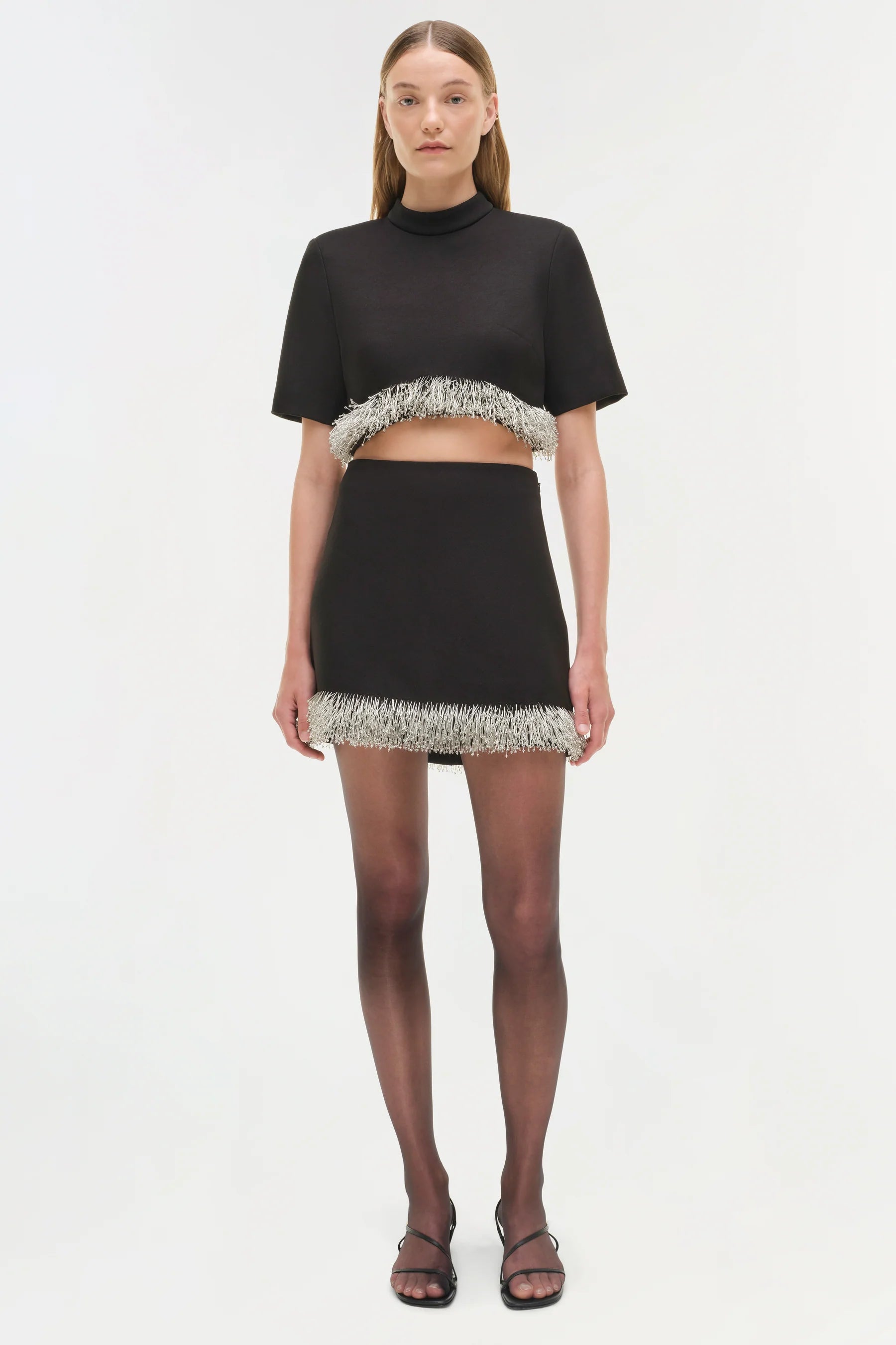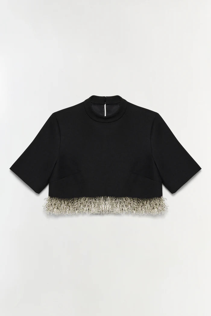 Top cropped de cuello alto con mangas cortas alargadas y un dobladillo inclinado adornado.