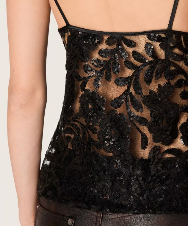 Realizado en tul negro con motivo floral de lentejuelas negras, este top para mujer presenta un corte slim con cuello en V y tirantes finos en contraste. Para completar su estilo, el forro de crepé para un efecto transparente.
