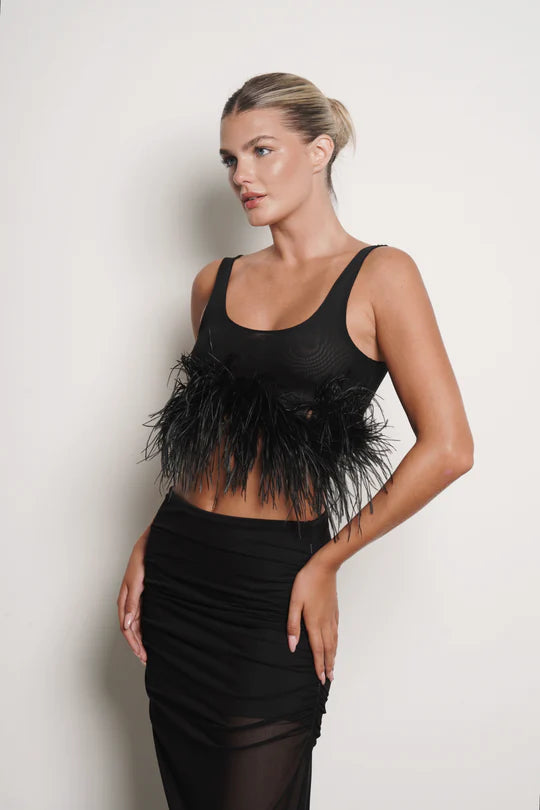 Un toque de lujo para tu look diario. Este top corto luce un suave y sofisticado detalle de plumas, lo que lo hace tan versátil como elegante. Combínalo con vaqueros para un look desenfadado o con prendas llamativas para ocasiones especiales: tú decides.