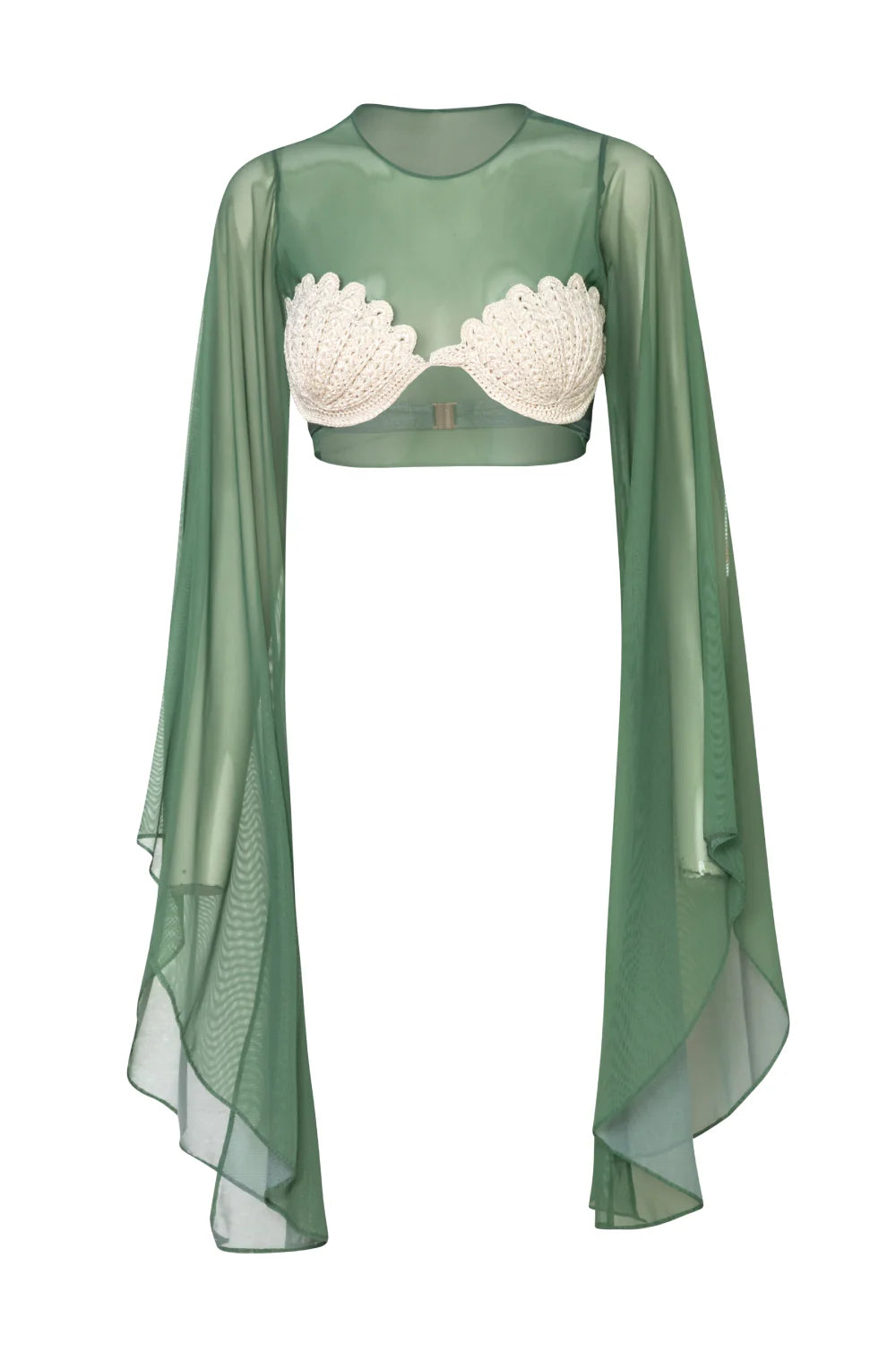 El Ela del Mar Mesh Top refleja versatilidad y elegancia. Sus conchas tejidas en crochet junto con sus mangas fluídas lo convierten en un top único que destaca en cualquier ocasión. Úsalo con el bottom a juego para un look de playa, o combínalo con tus prendas favoritas para crear un estilo que refleje tu esencia.