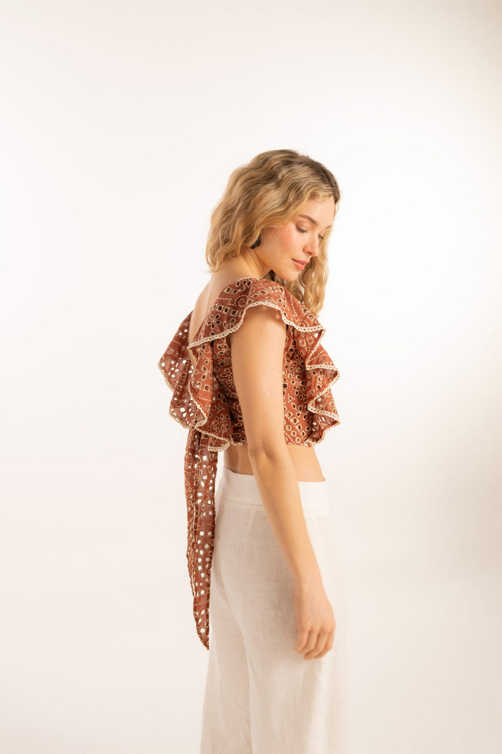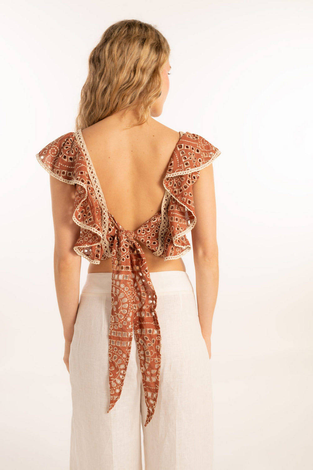 Elegante camisa en tela hoja rota de textura suave y caída fluida. Diseño sofisticado con golas y escote profundo que estiliza la figura. Detalle distintivo de anudado en la espalda que añade un toque sensual y moderno. detalles en encaje que aportan feminidad y distinción. Perfecta para ocasiones especiales o salidas casuales elegantes, combinando comodidad, estilo y un toque de seducción.