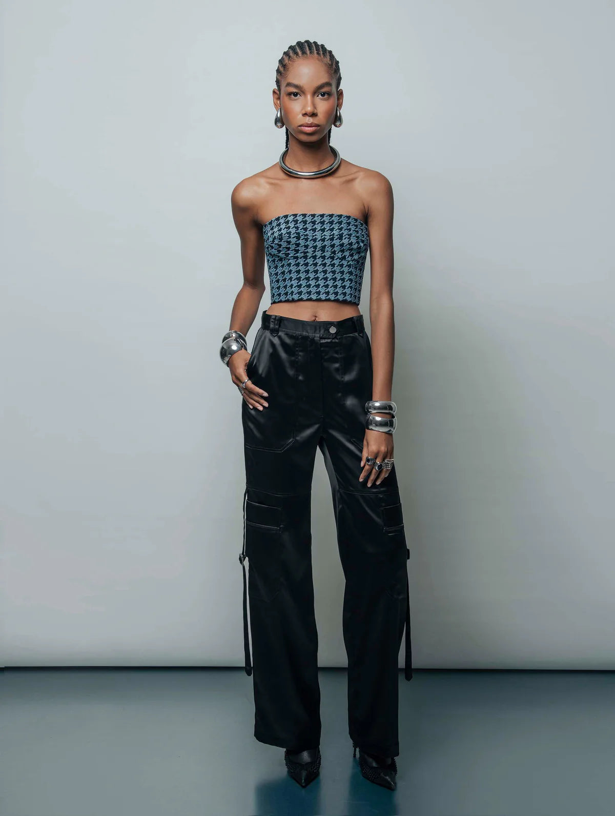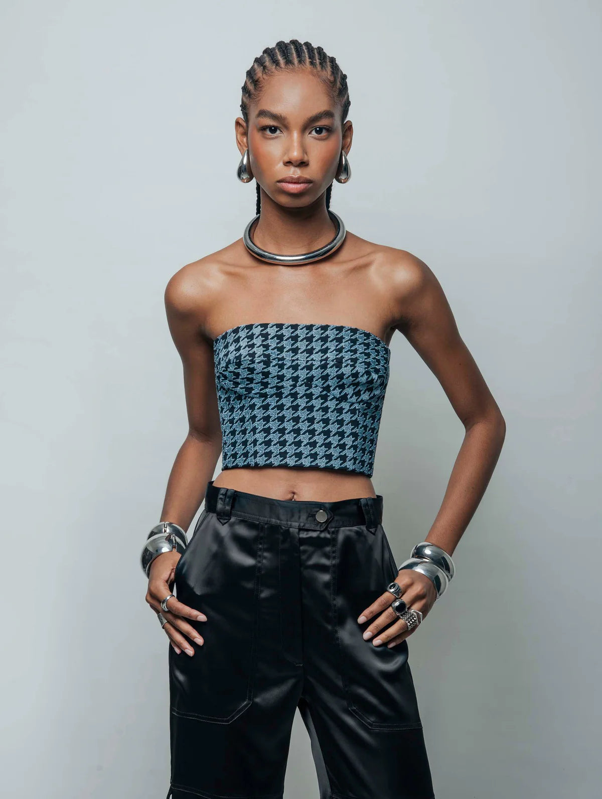 GALLUS II. Un top corto estilo corsé con bordado de pied de poule en azul Wallis, con escote recto y copa sin costuras. Una cremallera de níquel en la parte central de la espalda le aporta estructura y ligereza. Una prenda atrevida y sensual que añade un toque provocador a cualquier look.