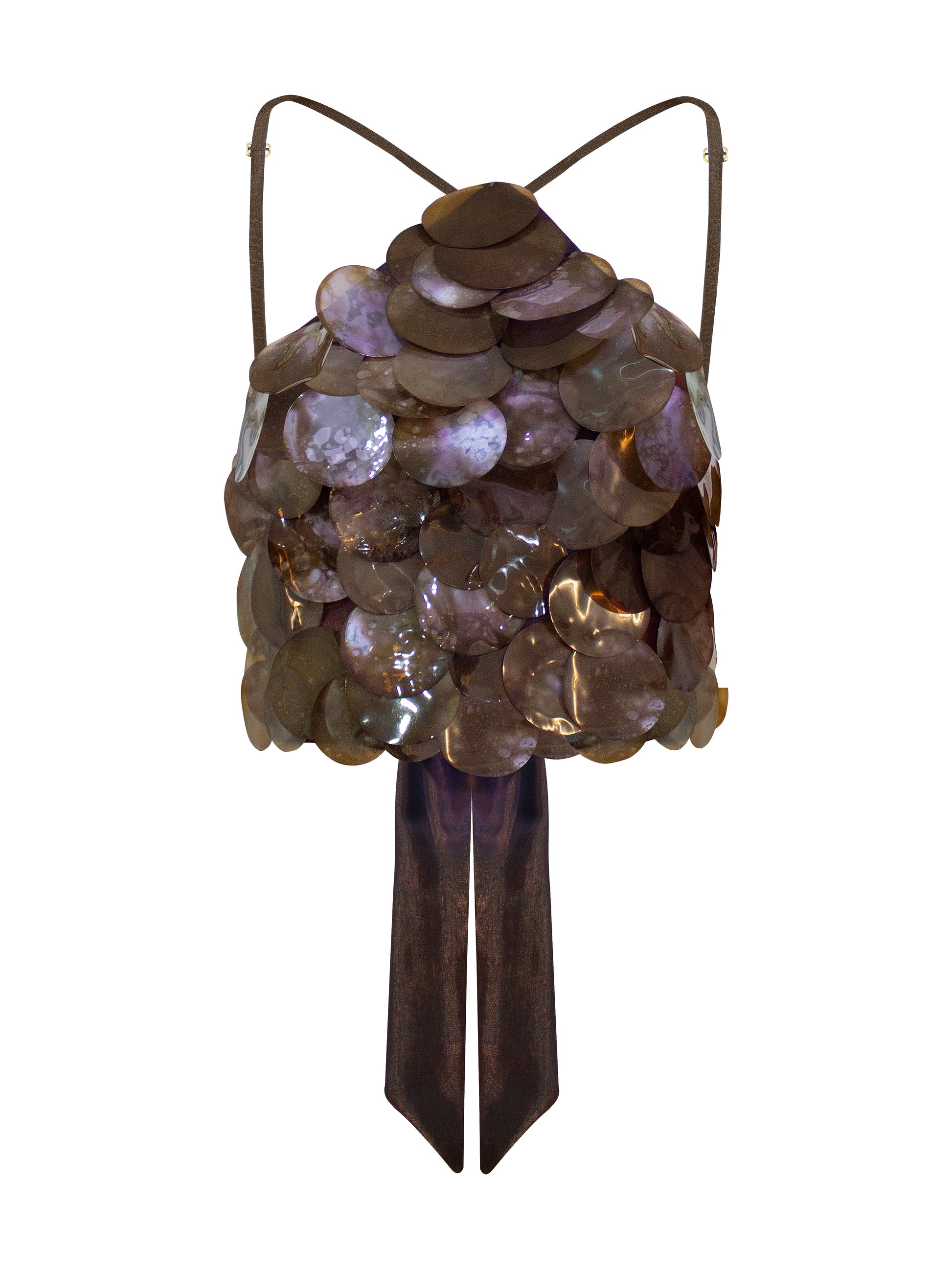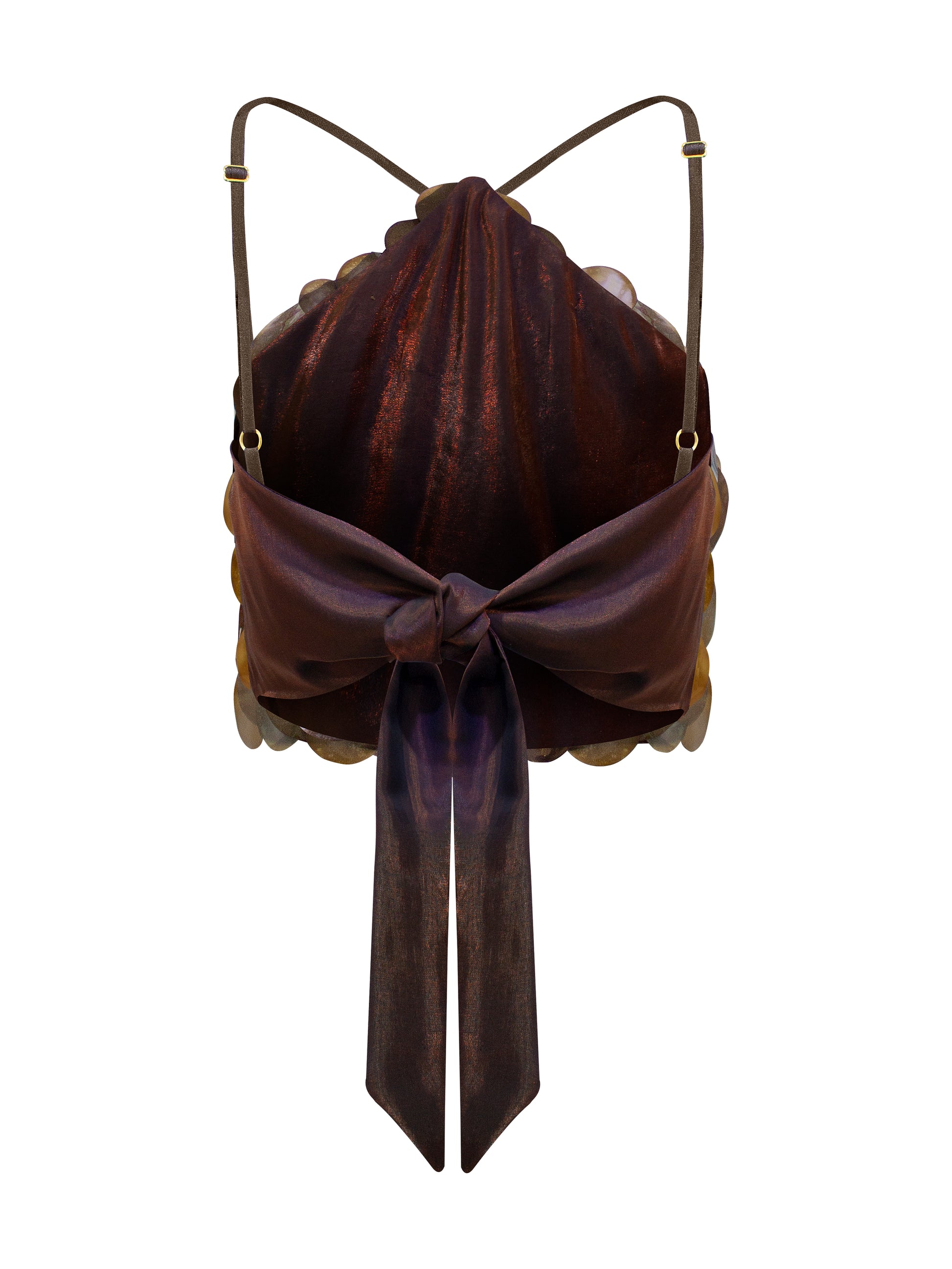 Top artesanal con paillettes circulares superpuestas que crean un efecto escamado de alto brillo. Con tiras finas ajustables y un lazo posterior que cae en un elegante lazo doble, combina sensualidad y sofisticación. Ideal para elevar looks nocturnos con un toque de glamour iridiscente.