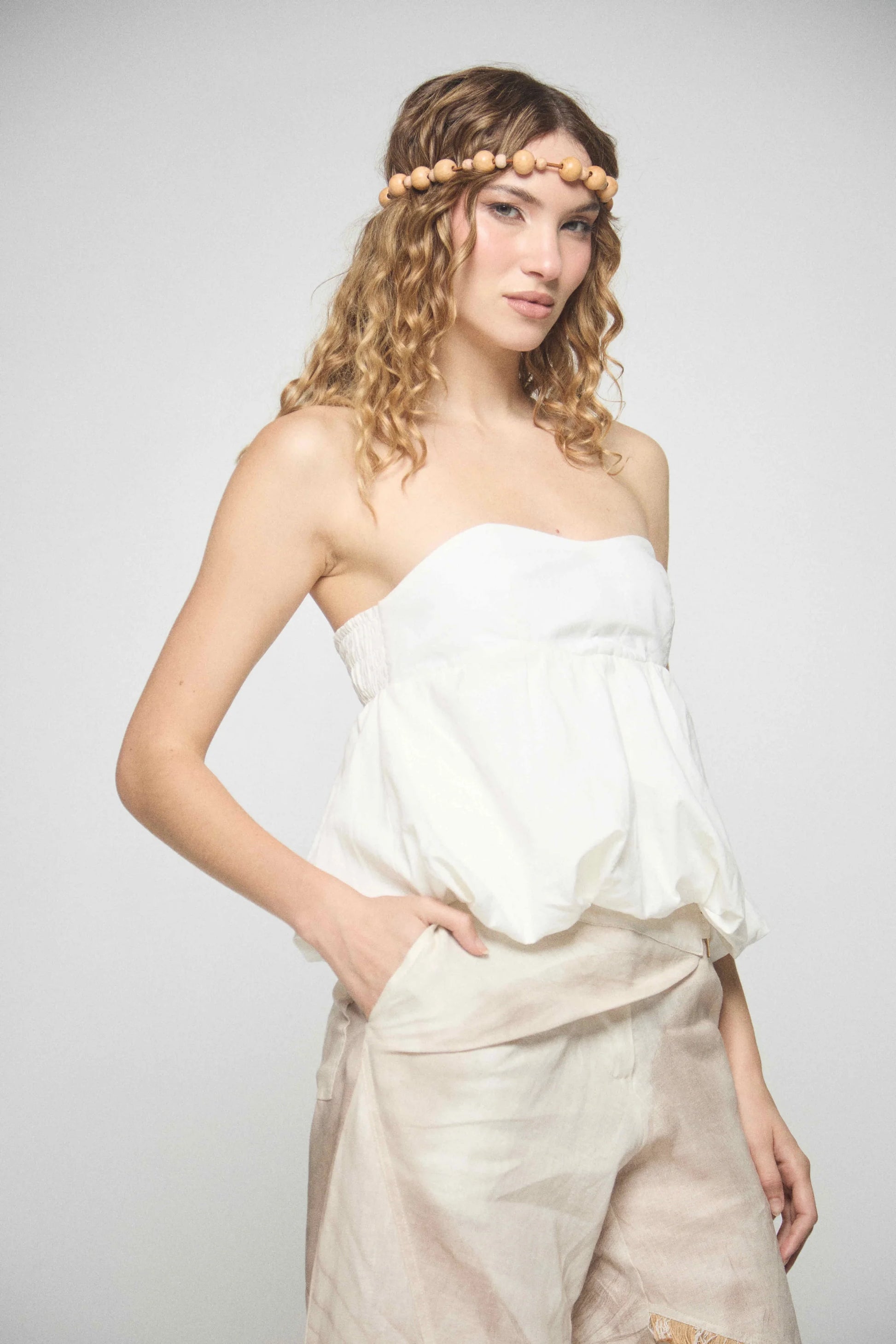 El top Halo es fresco, femenino y sumamente versátil. Hecho 100 % de lino , es transpirable, ligero e ideal para climas cálidos. Su silueta globo aporta estructura y volumen de forma favorecedora, haciéndolo perfecto para todo tipo de cuerpo, con una caída perfecta sin ceñirse.