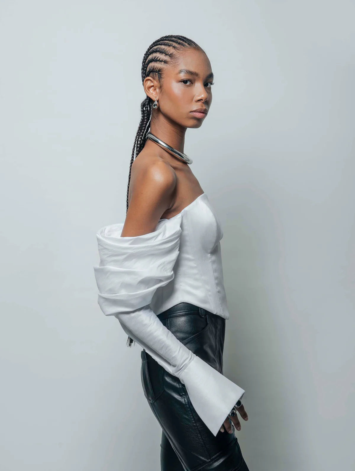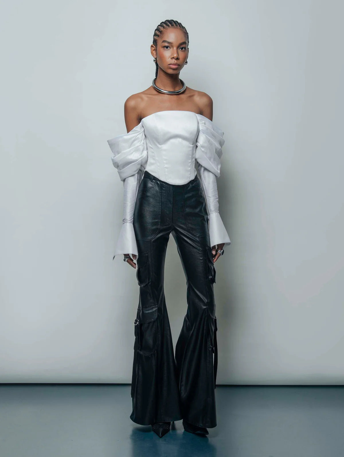 MAGNUM. Un corsé con mangas de alma femenina y un toque cosmopolita, impregnado de una estética masculina y estructurada. Su versatilidad le permite combinarse a la perfección con cortes de tiro alto y bajo. Las mangas drapeadas estilo camisa con puños se combinan con un escote palabra de honor, mientras que los cortes anatómicos y la estructura interna de ballenas esculpen la cintura, acentuando la silueta femenina con audaz precisión.