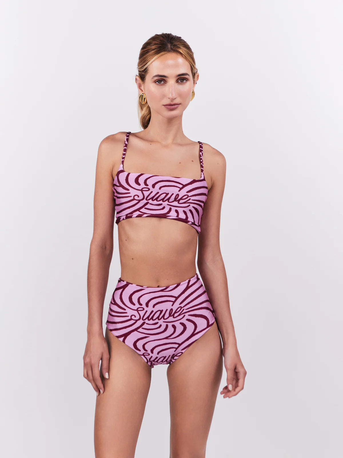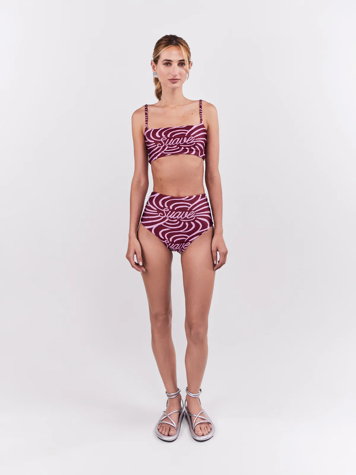 Top de bikini bandeau con tirantes ajustables. Esta pieza fue elaborada con poliéster reciclado. Protección solar hasta UPF 50.