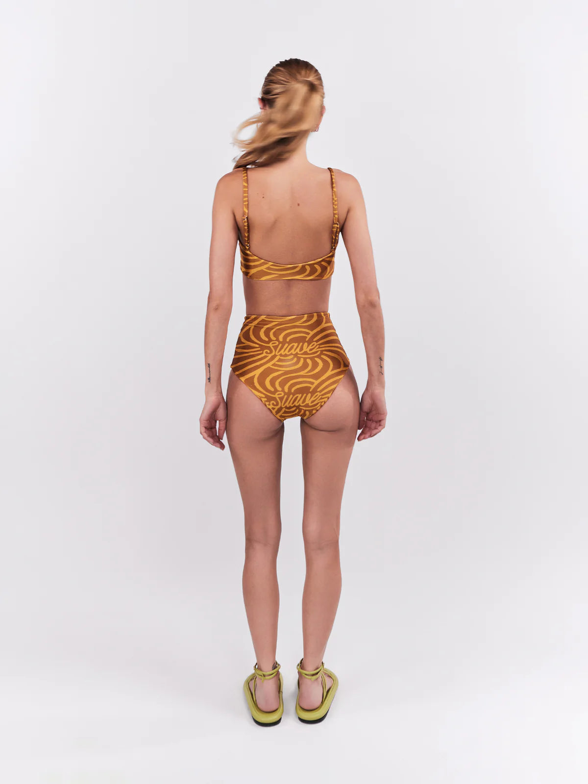 Top de bikini bandeau con tirantes ajustables. Esta pieza fue elaborada con poliéster reciclado. Protección solar hasta UPF 50.