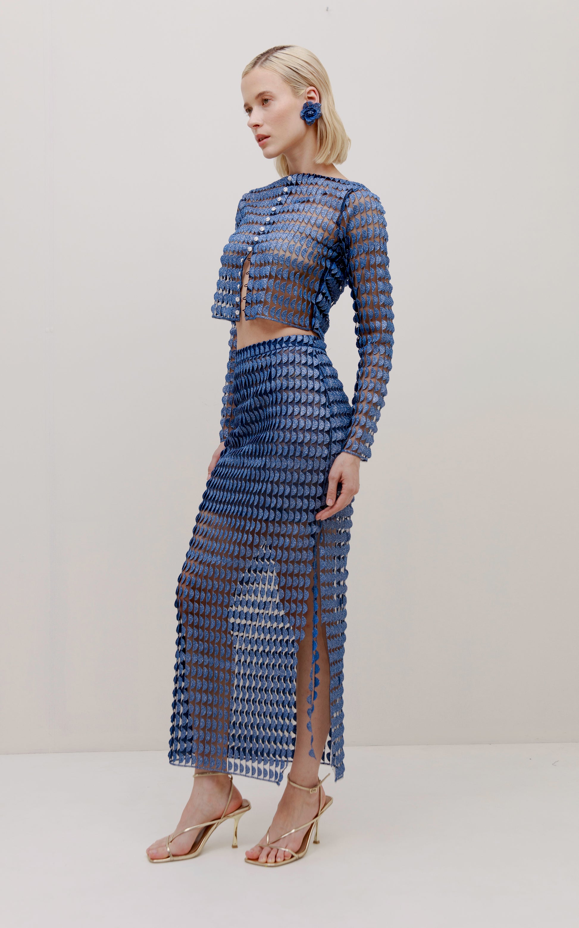 Top manga larga y parte del abdomen al descubierto confeccionado en un tejido semitransparente con textura distintiva. En un tono azul, y textura estilo escamas fusionándose con el diseño. Las mangas son ajustadas y largas, top de un estilo atrevido y fresco.