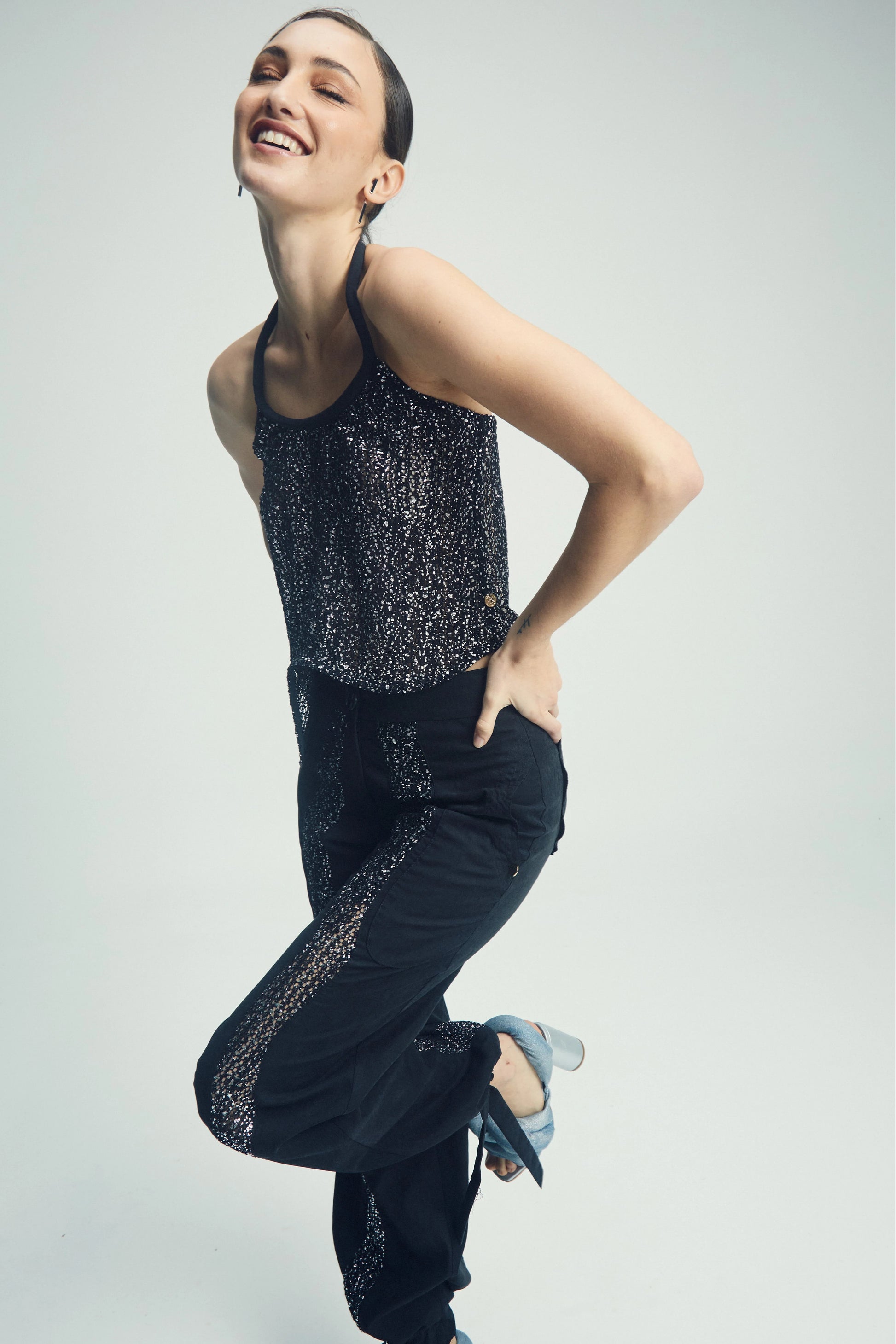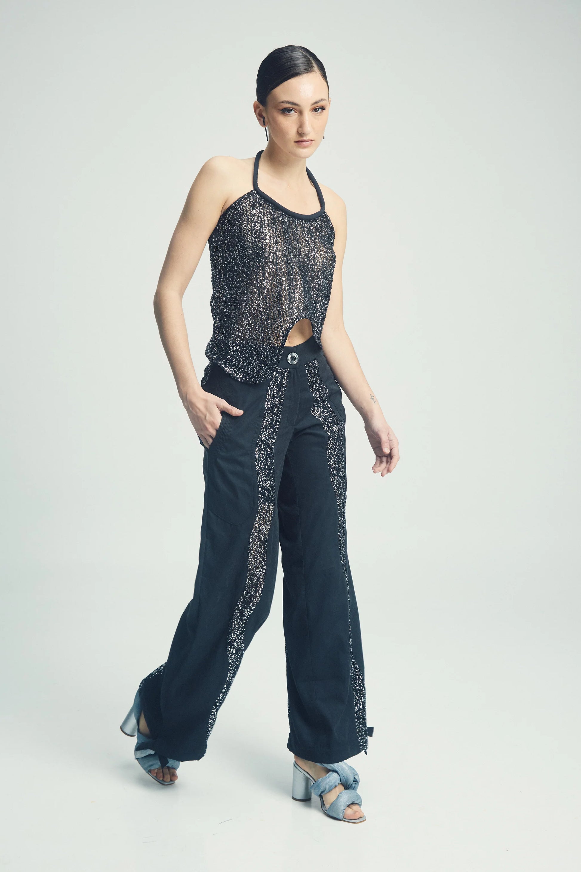 El top negro Serpienta es la prenda perfecta para la temporada: atemporal, versátil y con un brillo sutil que realza cualquier look. Diseñado en un clásico tono negro con detalles brillantes, presenta un escote alto y un bajo ondulado que le da movimiento y sofisticación.