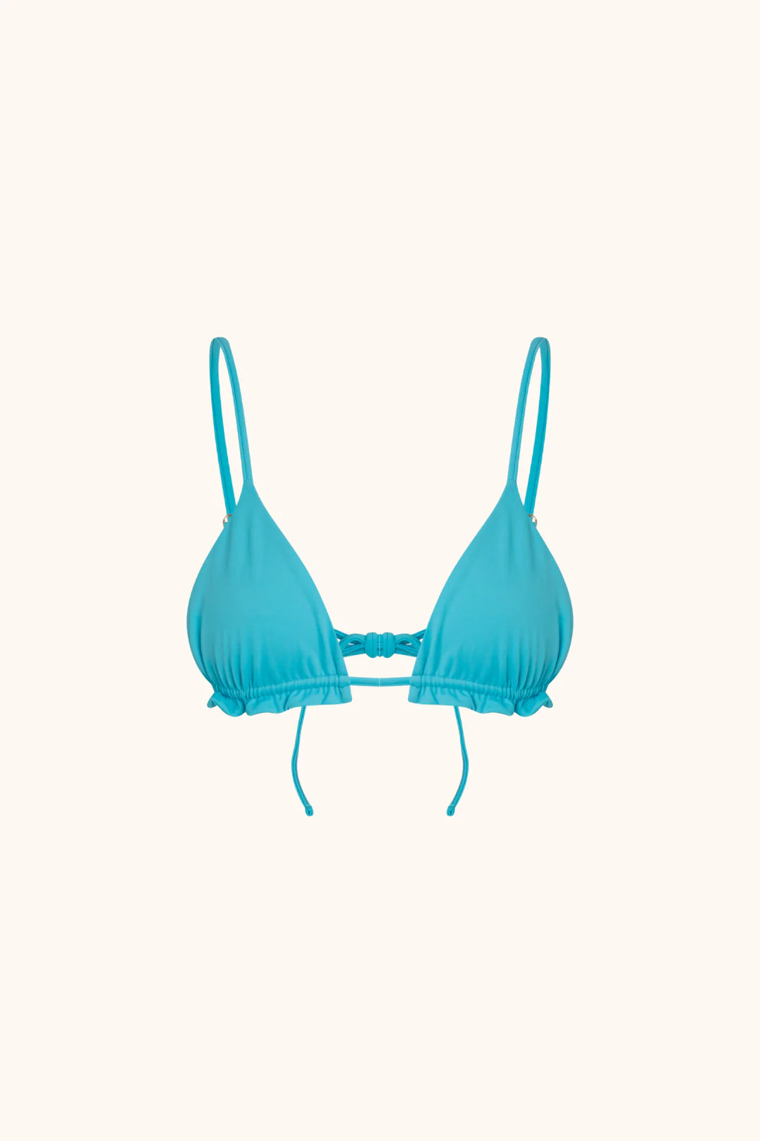Elaborada con un toque de nostalgia, esta exquisita pieza captura la esencia de los días de playa sin preocupaciones y los recuerdos bañados por el sol. La parte superior clásica triangular te permite moverte con libertad y confianza mientras disfrutas de la vida en la playa. Y como nos gusta torcer las cosas, le agregamos algunos volantes para convertirlo en un top clásico pero coqueto.