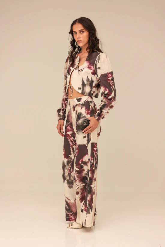 Su silueta ondulada al frente le aporta movimiento y estructura, mientras que el print mezcla tonos burgundy, rosado y marfil que evocan atardeceres tropicales.