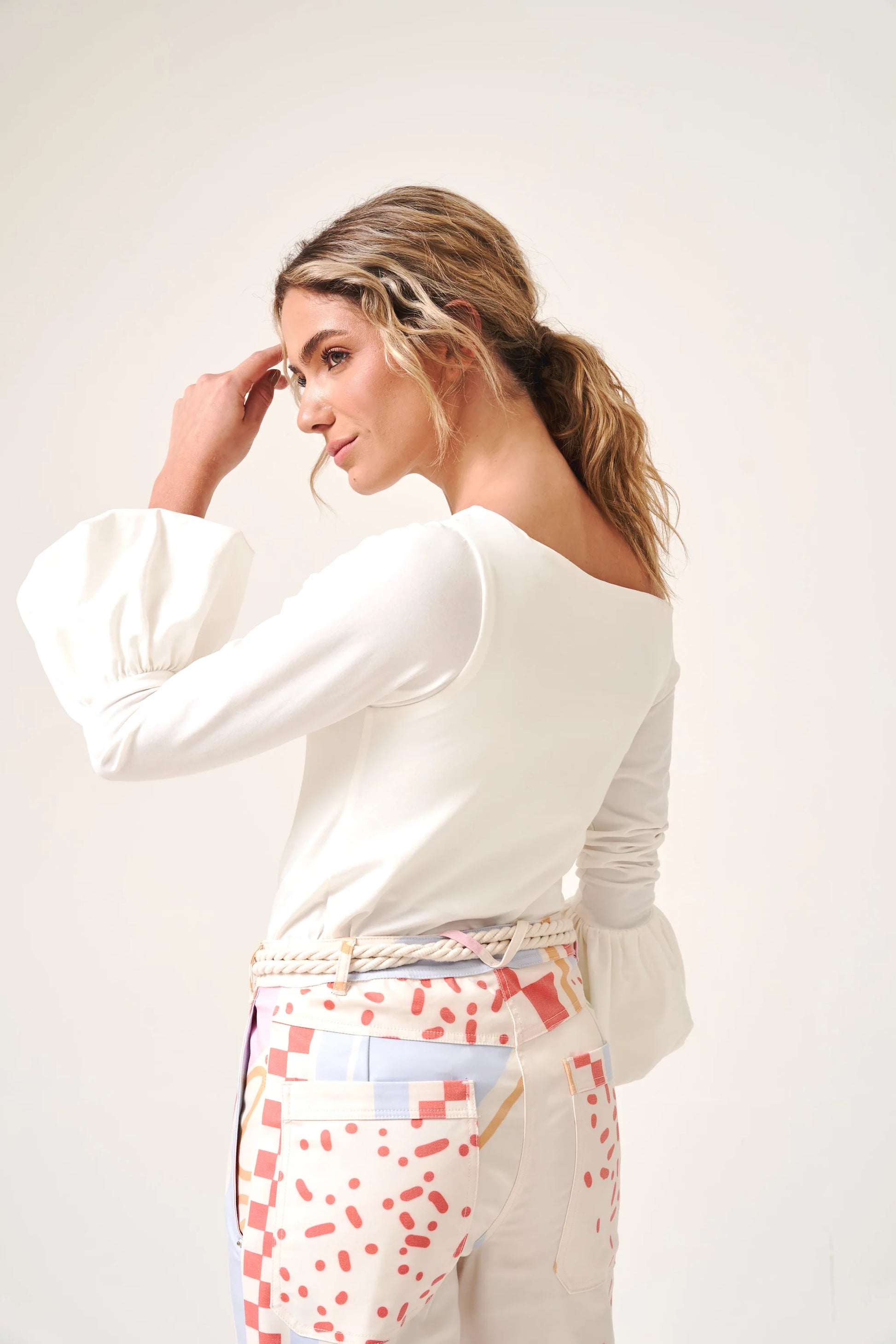 Top de algodón y spandex con escote irregular y mangas globo en la parte inferior.