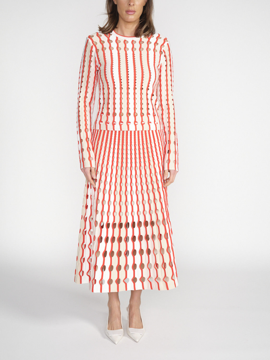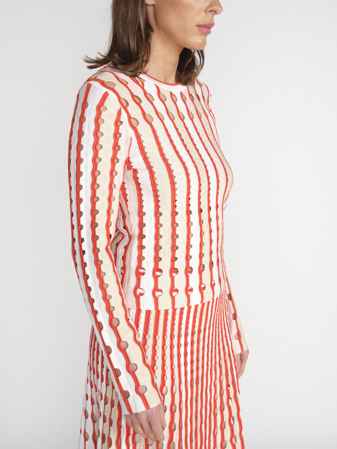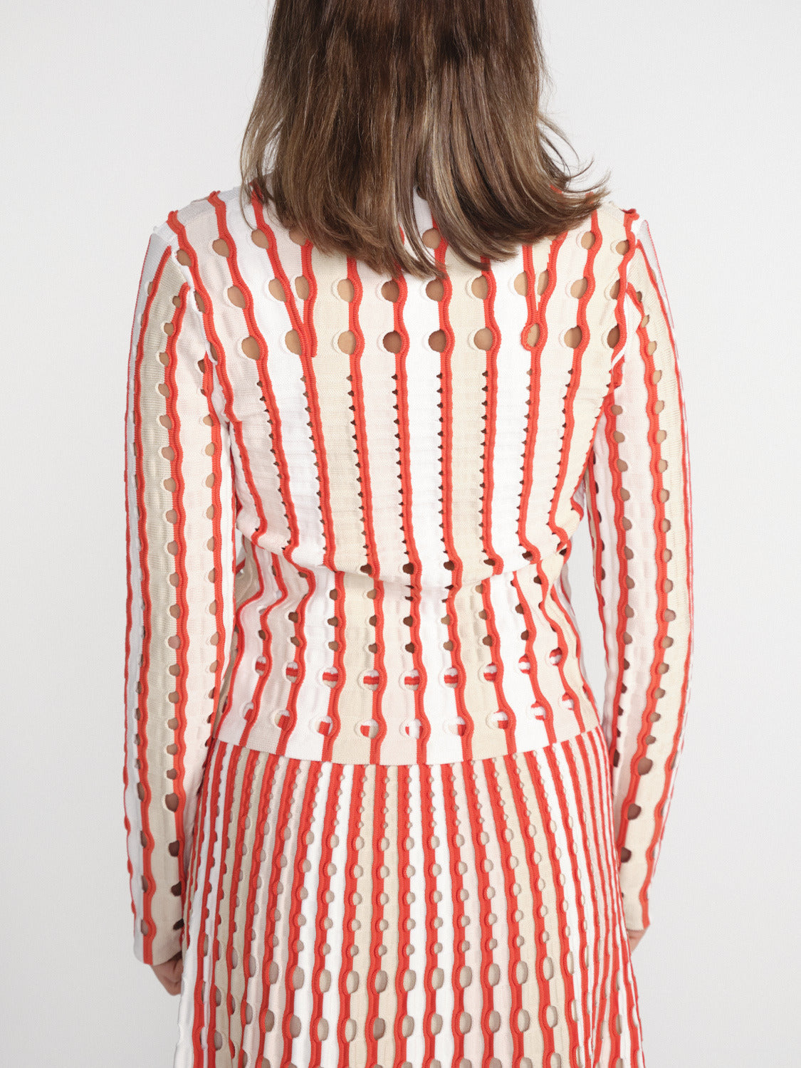 El top Tiana esculpe los contornos de tu cuerpo con un tejido acanalado sedoso, tejido con un patrón de rayas y salpicado de cortes esféricos a lo largo del escote para revelar el más mínimo pico de piel.