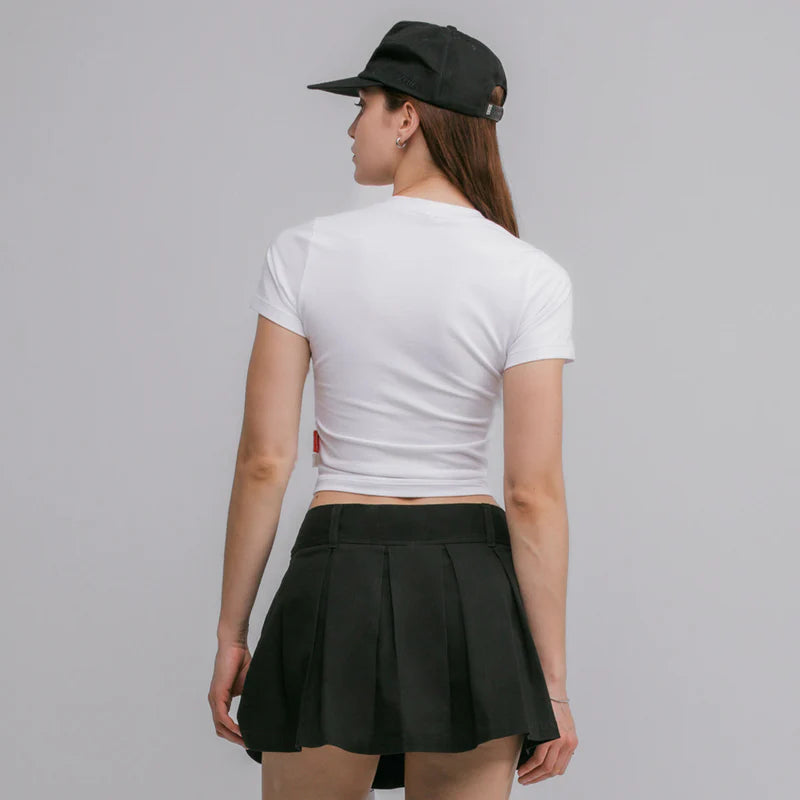 Camiseta blanca pegada y cortica hecha en algodón con un estampado adelante.