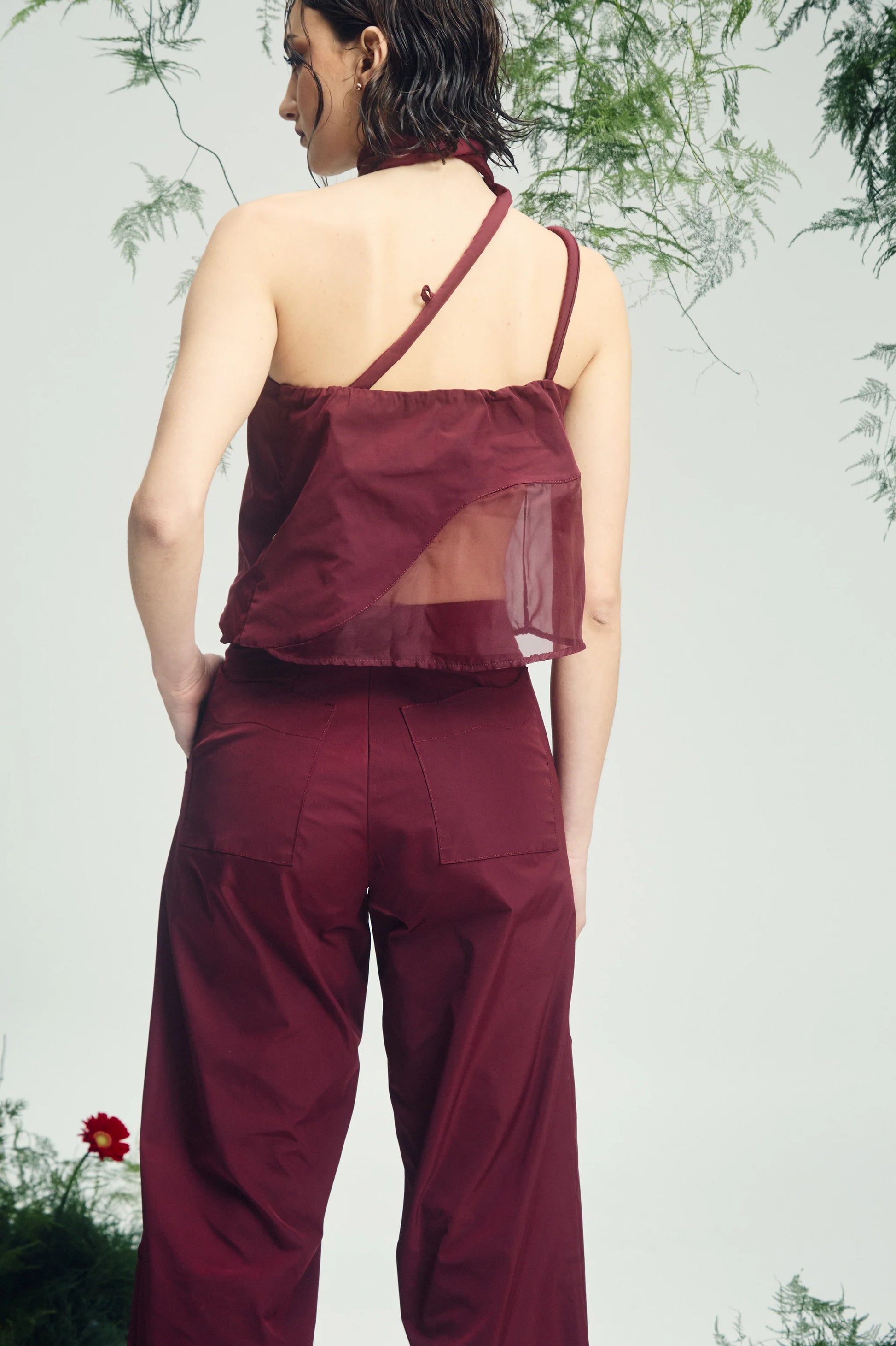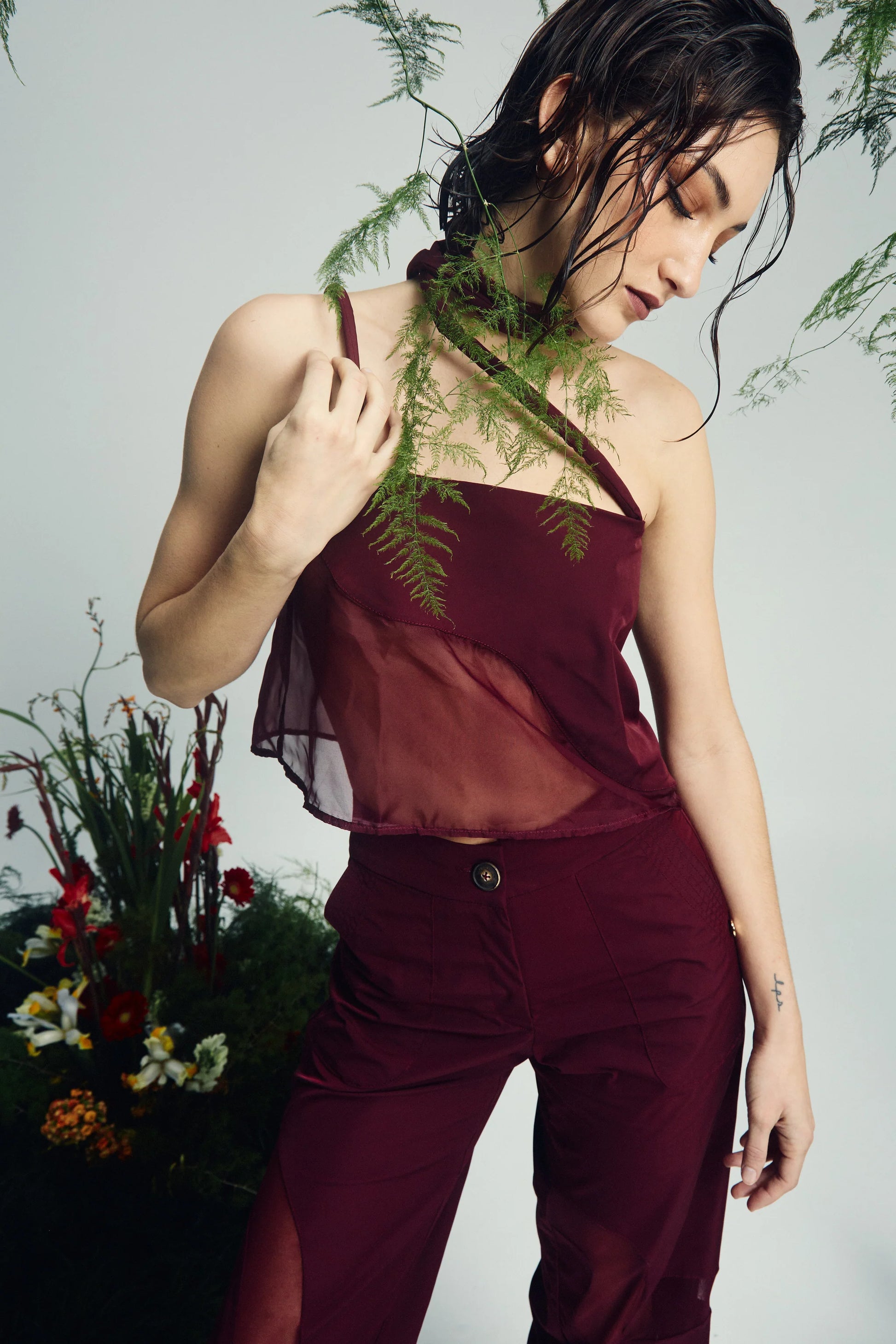 Elaborado con una mezcla de tejidos estructurados y translúcidos, crea un contraste fluido y ondulado que realza el movimiento, a la vez que se mantiene ligero y cómodo. El lazo en el escote ofrece versatilidad: llévalo con elegancia alrededor del cuello o déjalo caer naturalmente como un tirante, adaptándose a cualquier ocasión.