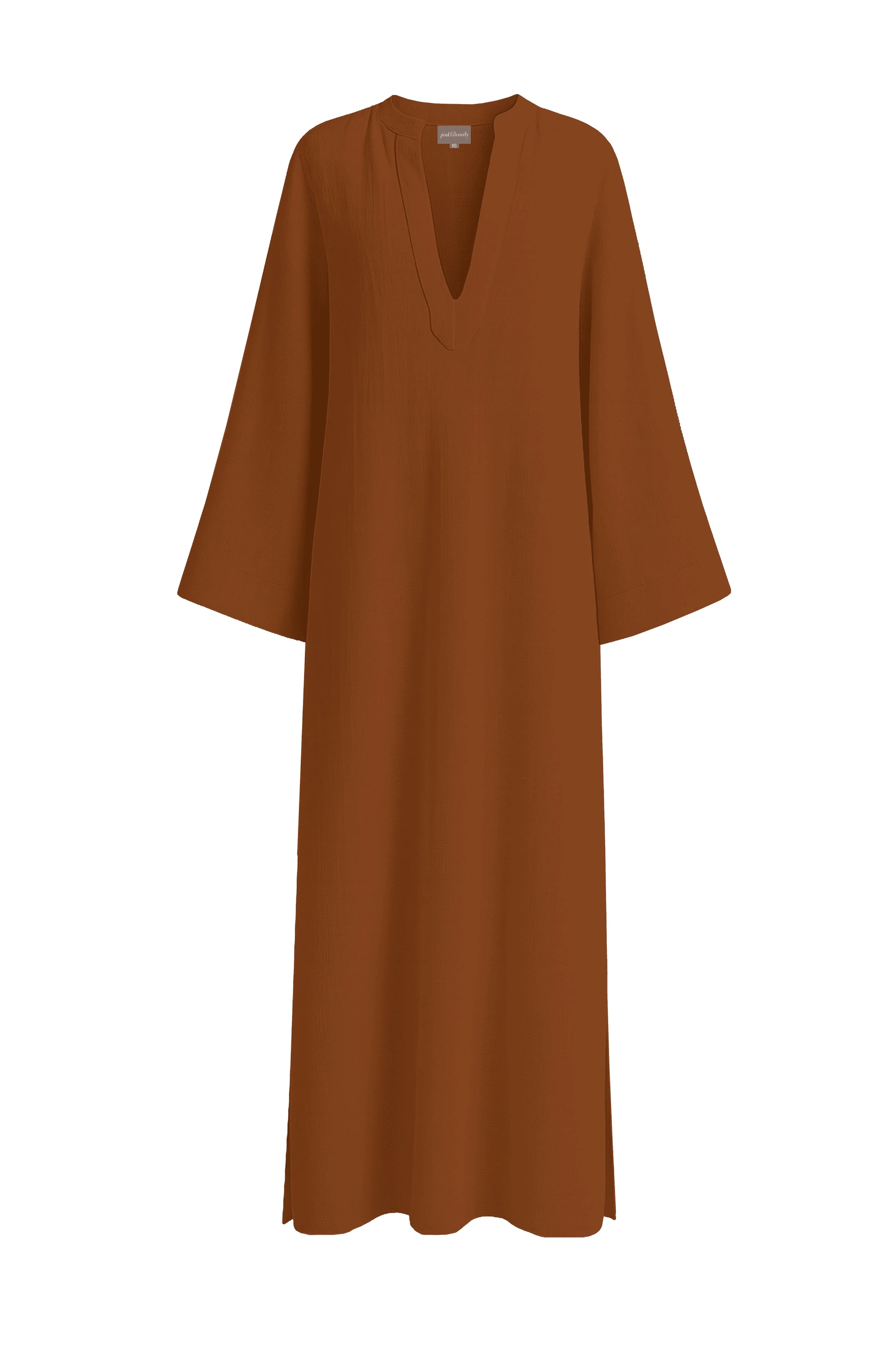 Túnica en tejido plano. Silueta amplia. Escote profundo en V Falda con aberturas en los costados. Manga larga silueta amplia.