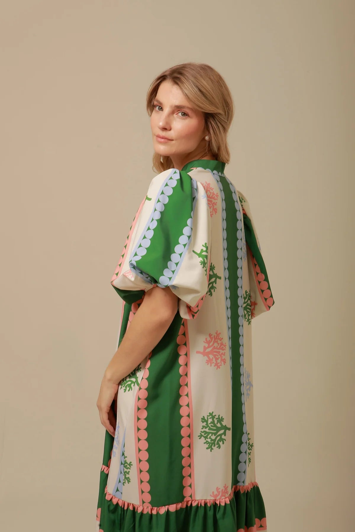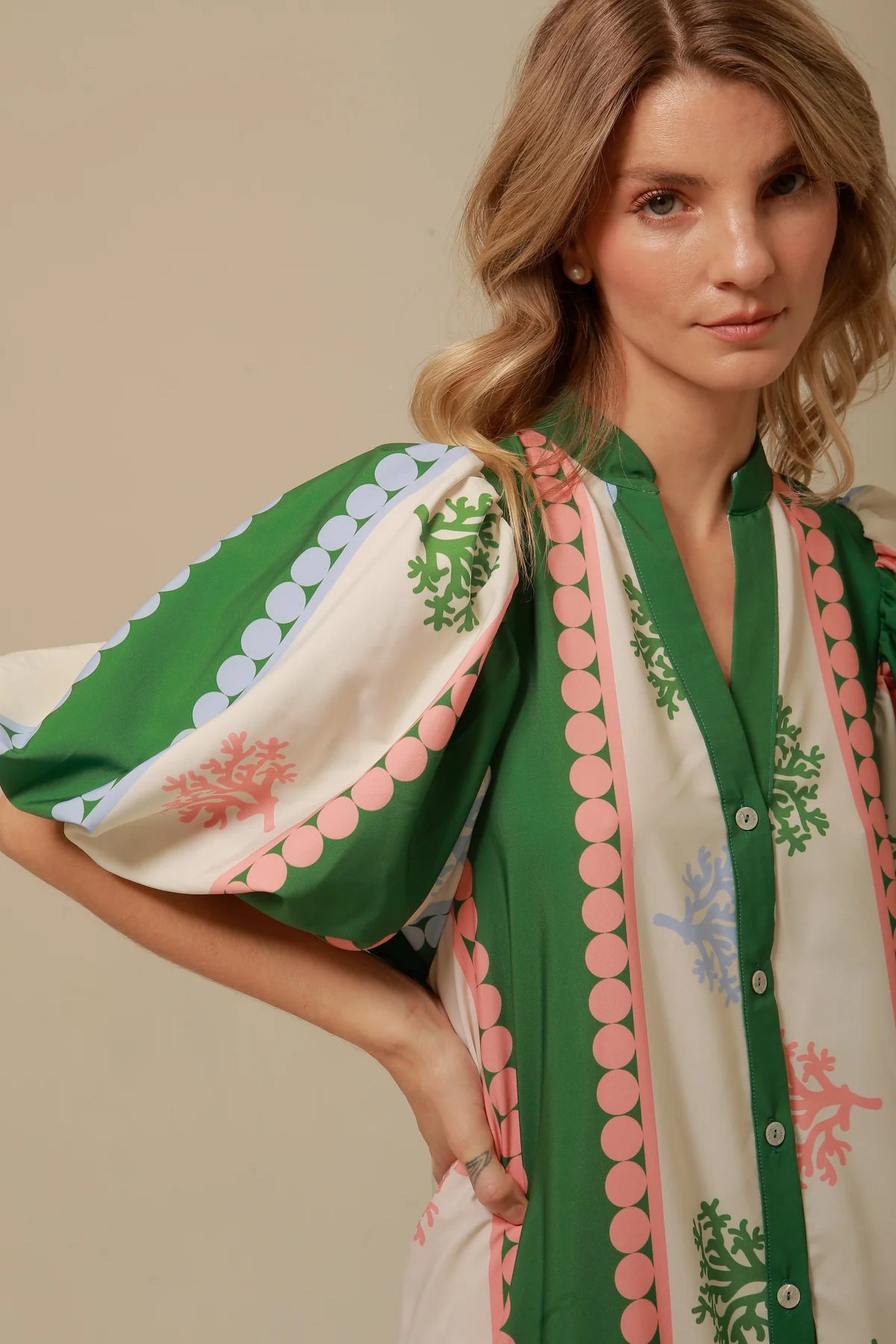 Vestido midi. Escote en V. Mangas abullonadas. Botones de cierre en parte frontal.