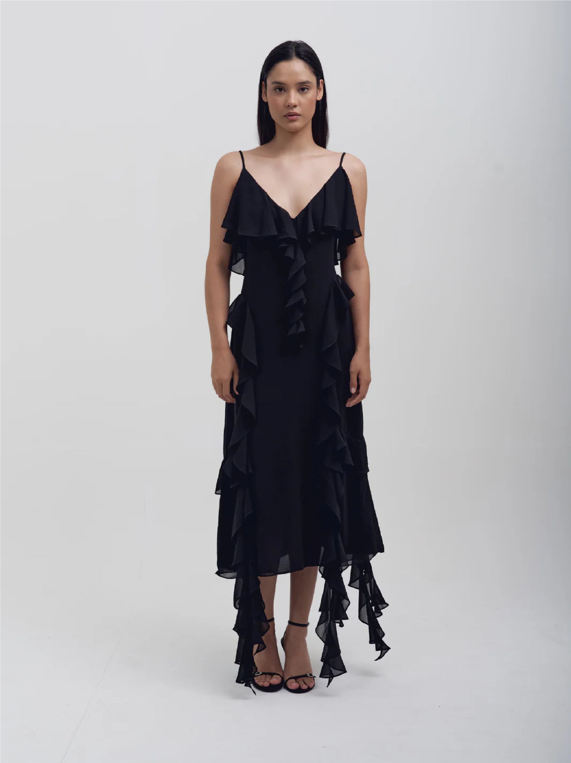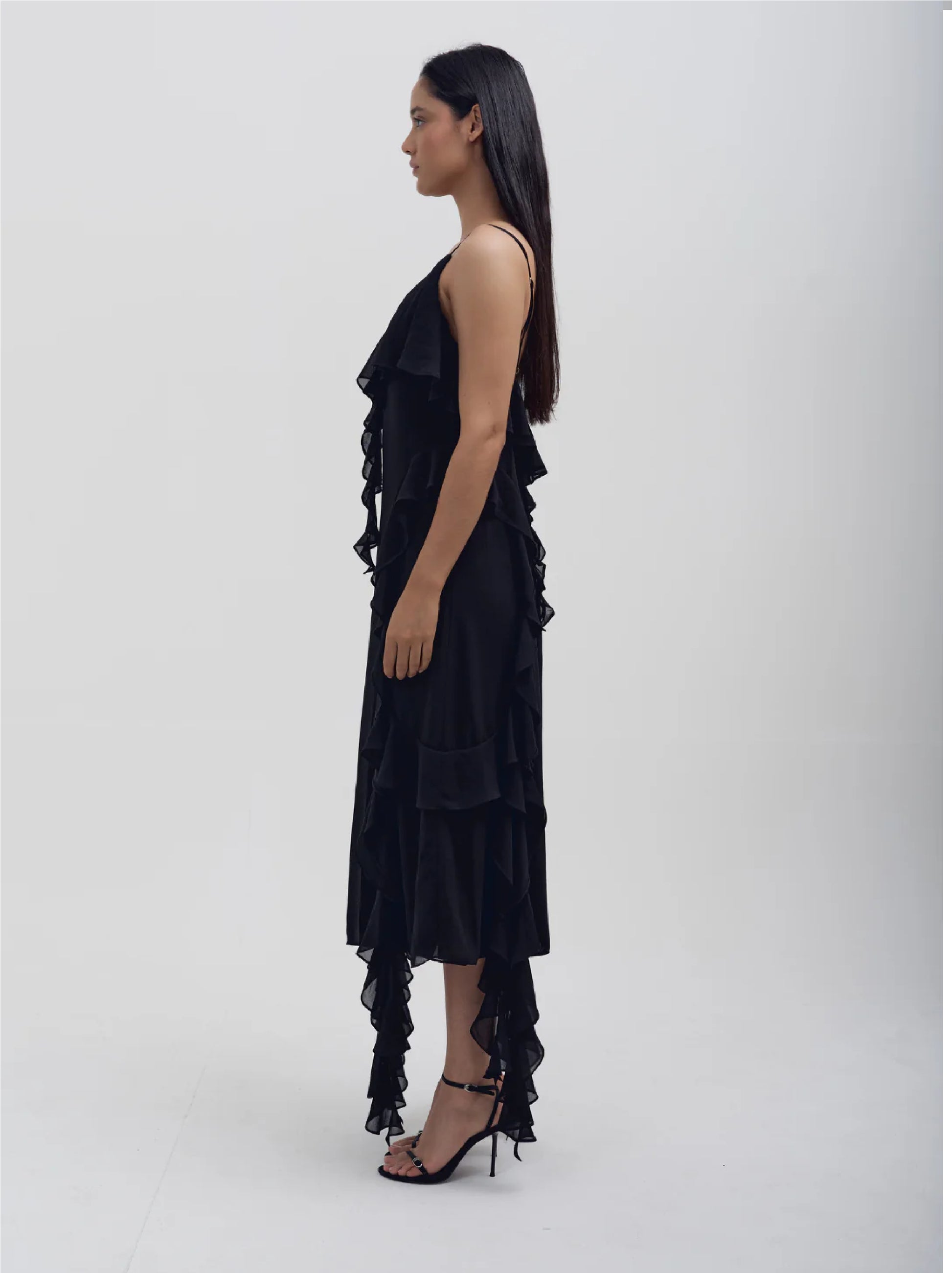Este es un vestido negro con múltiples capas de volantes y tirantes finos que caen sobre una espalda baja. El diseño de los volantes, superpuestos verticalmente, crea un efecto de cascada dinámico que desciende hasta un dobladillo asimétrico de largo midi a maxi, mientras que la tela, que parece ser gasa o un material similar ligero y semitransparente, contribuye a su movimiento fluido y su silueta etérea.