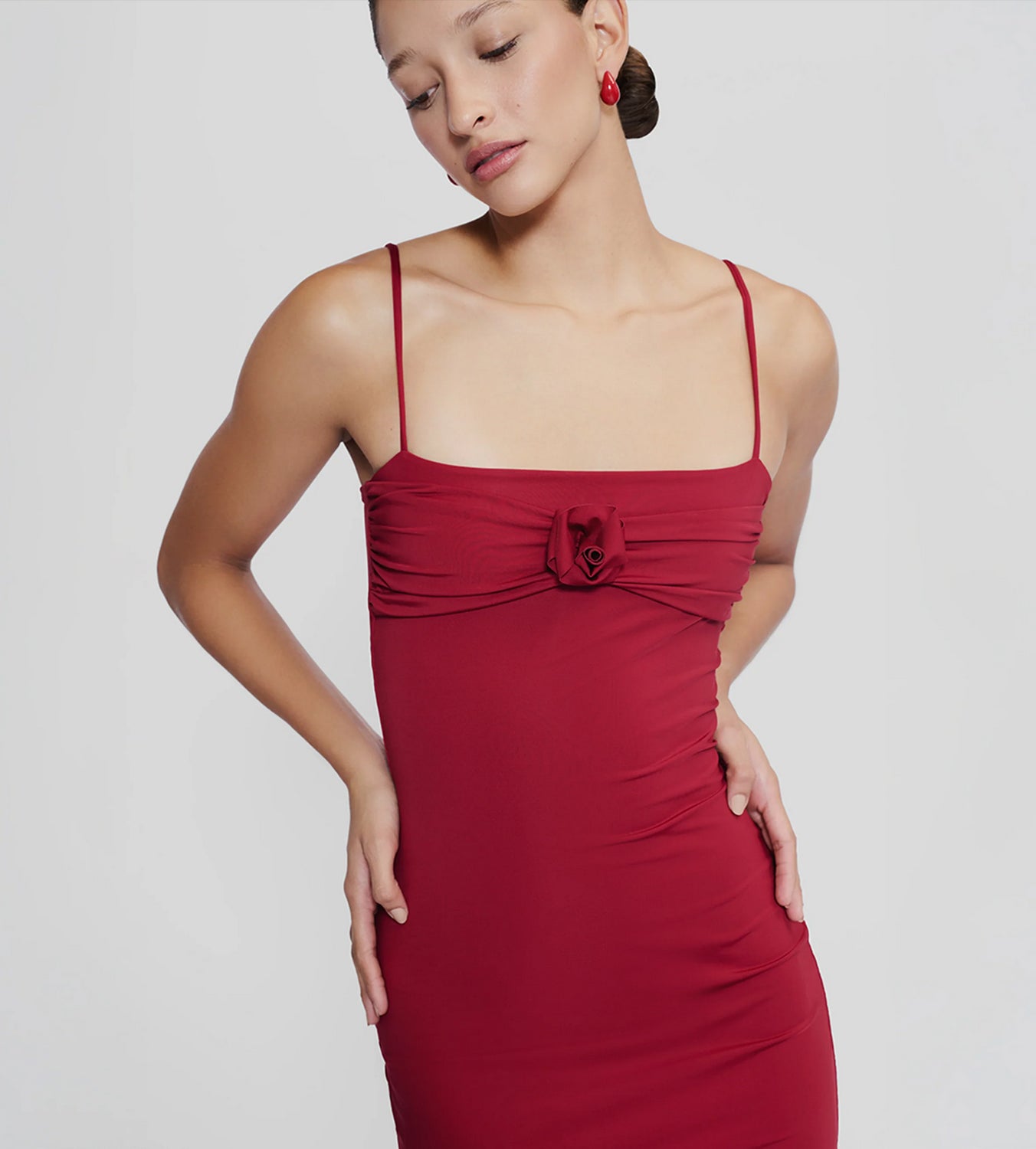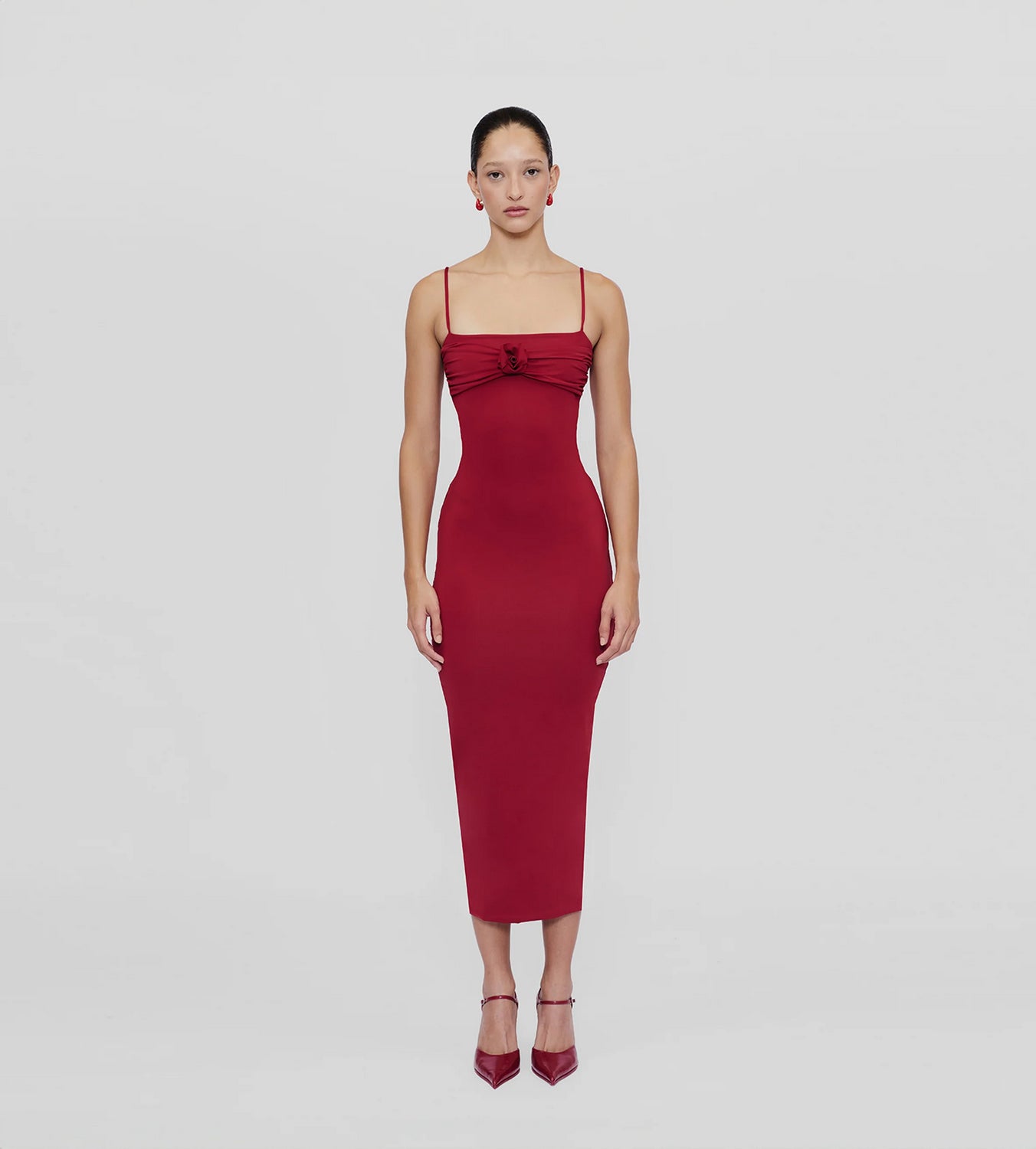El vestido Belén, en un rojo vibrante y festivo, refleja el espíritu de la temporada con su silueta elegante y detalles refinados. Los delicados tirantes finos y el corsé fruncido, adornado con una rosa hecha a mano, transmiten una sofisticación natural. Ideal para celebrar noches inolvidables con una aura de confianza y gracia.