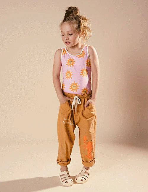 Nuestro Vestido de Baño Entero para Niñas: sin mangas y con un elegante cuello redondo, que se extiende hasta la espalda. Presenta un estampado de soles amarillos sobre un vibrante rosa. Para un toque retro que nos inspira profundamente, hemos añadido detalles de sesgos en contraste en color marfil. Además, cuenta con un forro interno en color blanco para mayor comodidad y calidad Hecho éticamente en Colombia Composición: 100% Polyester