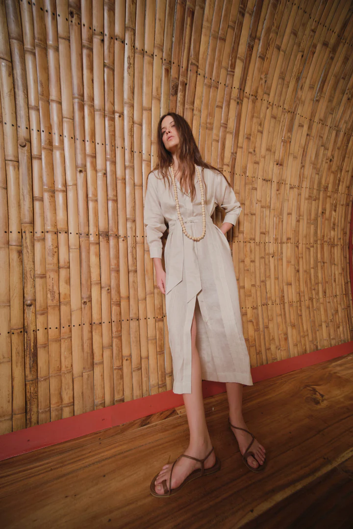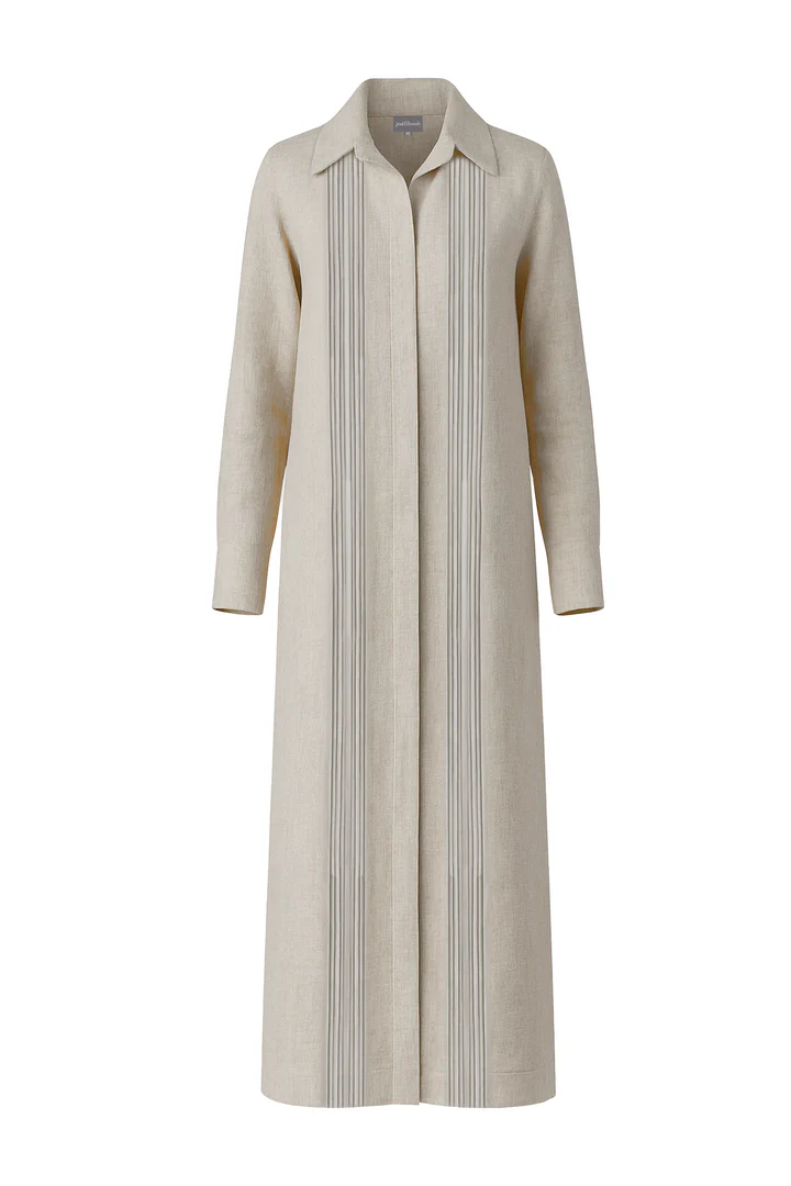 Vestido camisero tipo guayabera. Detalle de alforzas en el delantero y en el posterior. Silueta amplia y fluida. Manga larga con puño. Incluye cinturón.
