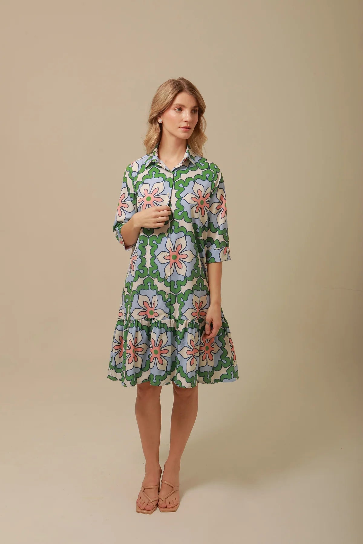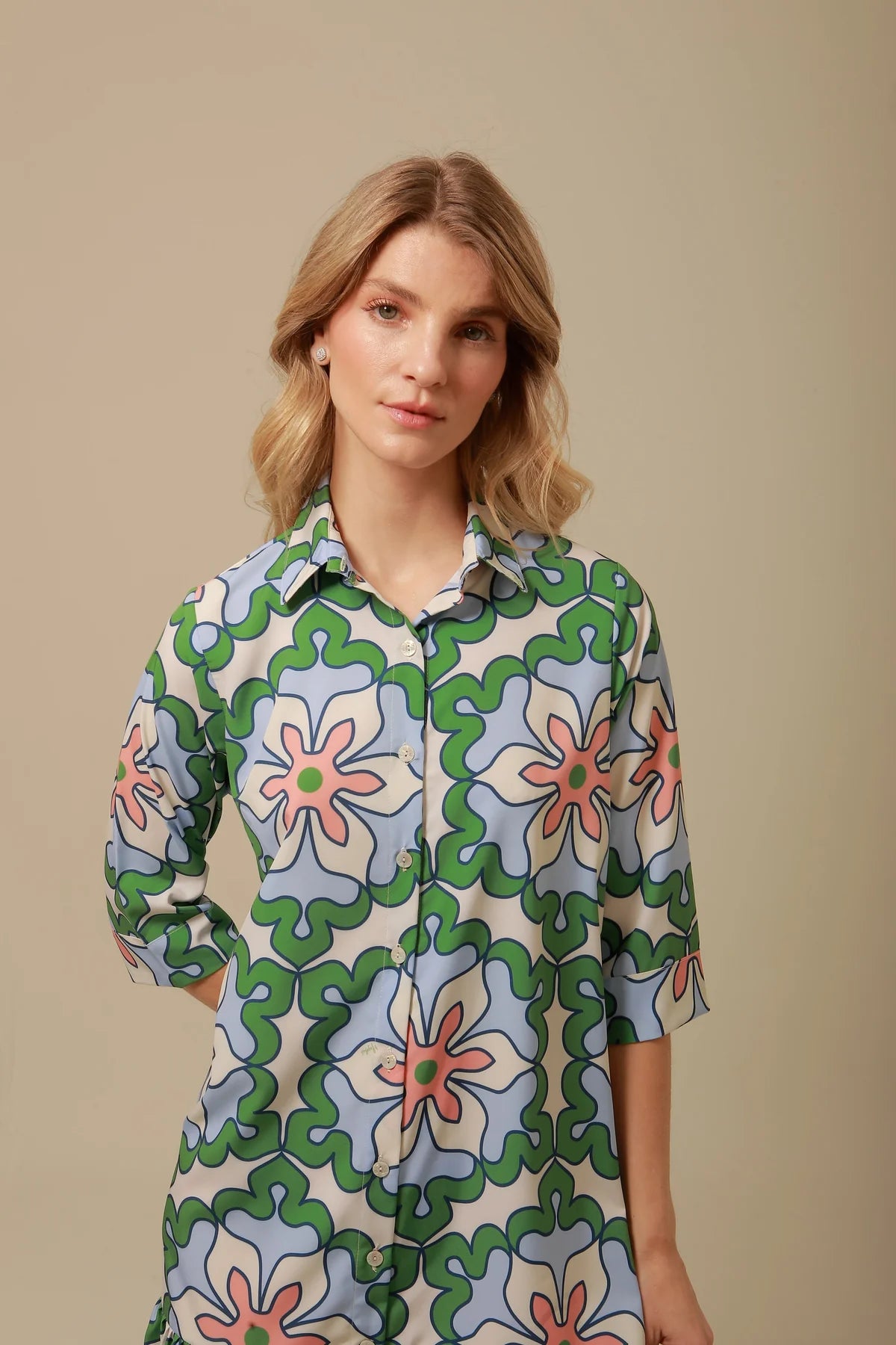 Vestido mini. Estilo camisa con botones frontales. Mangas 3/4.