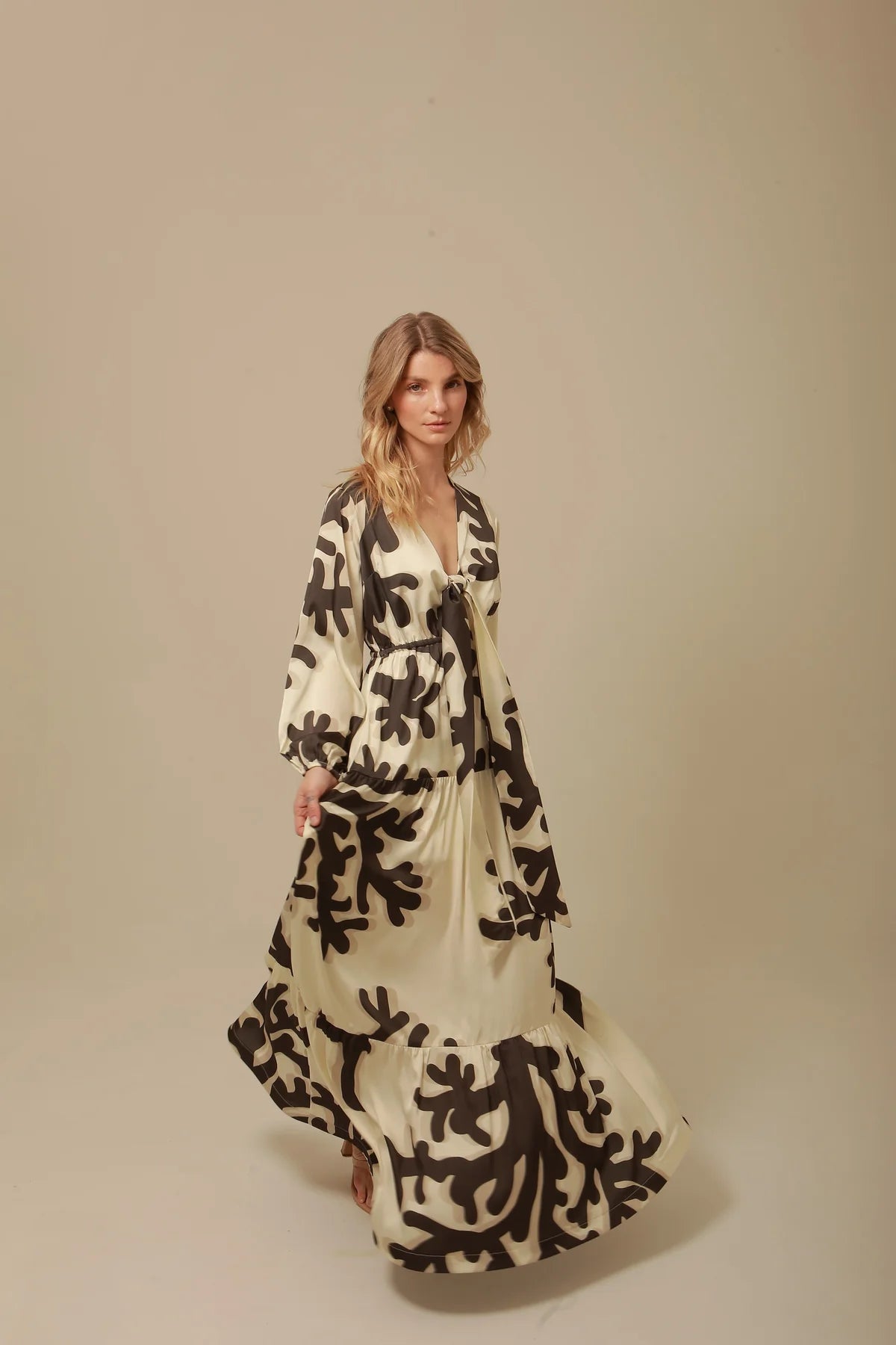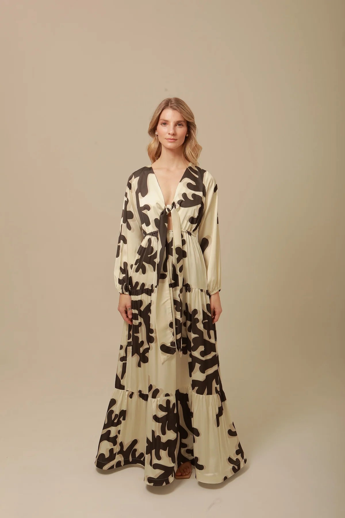 Vestido maxi de manga larga destaca por su elegante y fluida silueta. El escote en V profundo, con un delicado lazo frontal, añade un toque romántico y estilizado. Las mangas, de corte holgado, terminan en puños fruncidos que le dan un aire sofisticado.