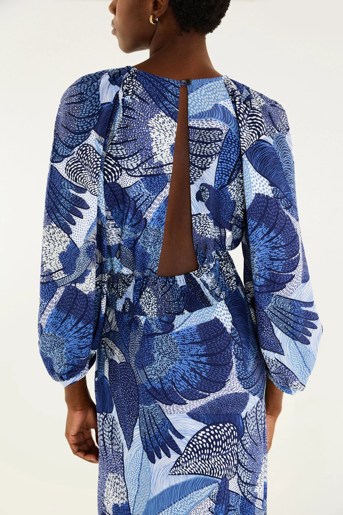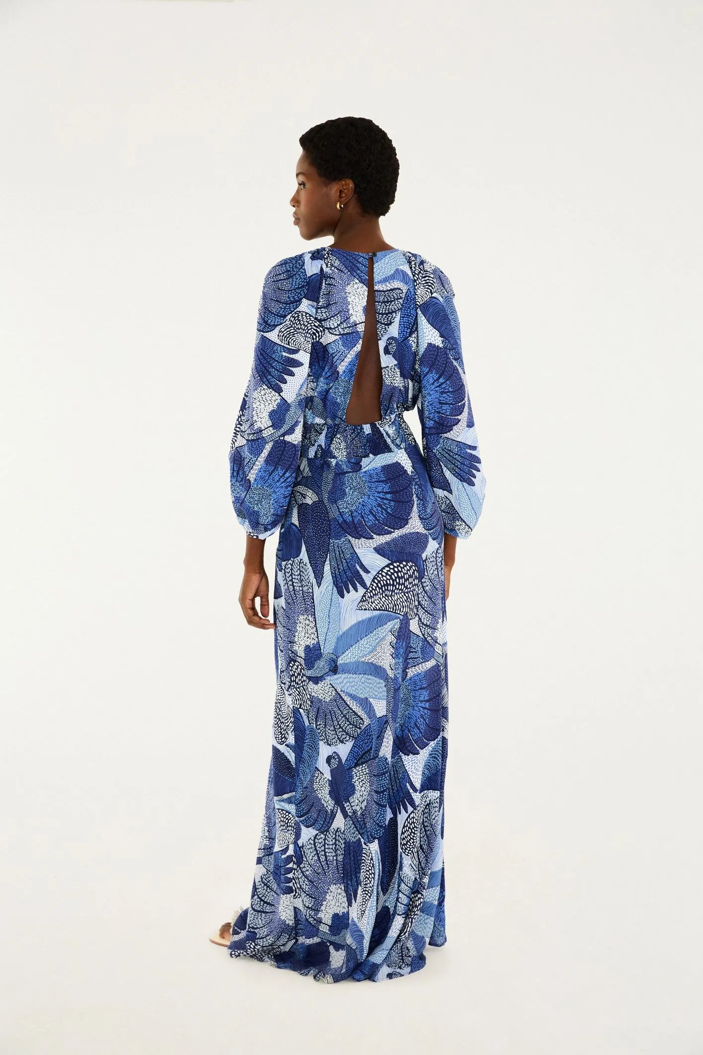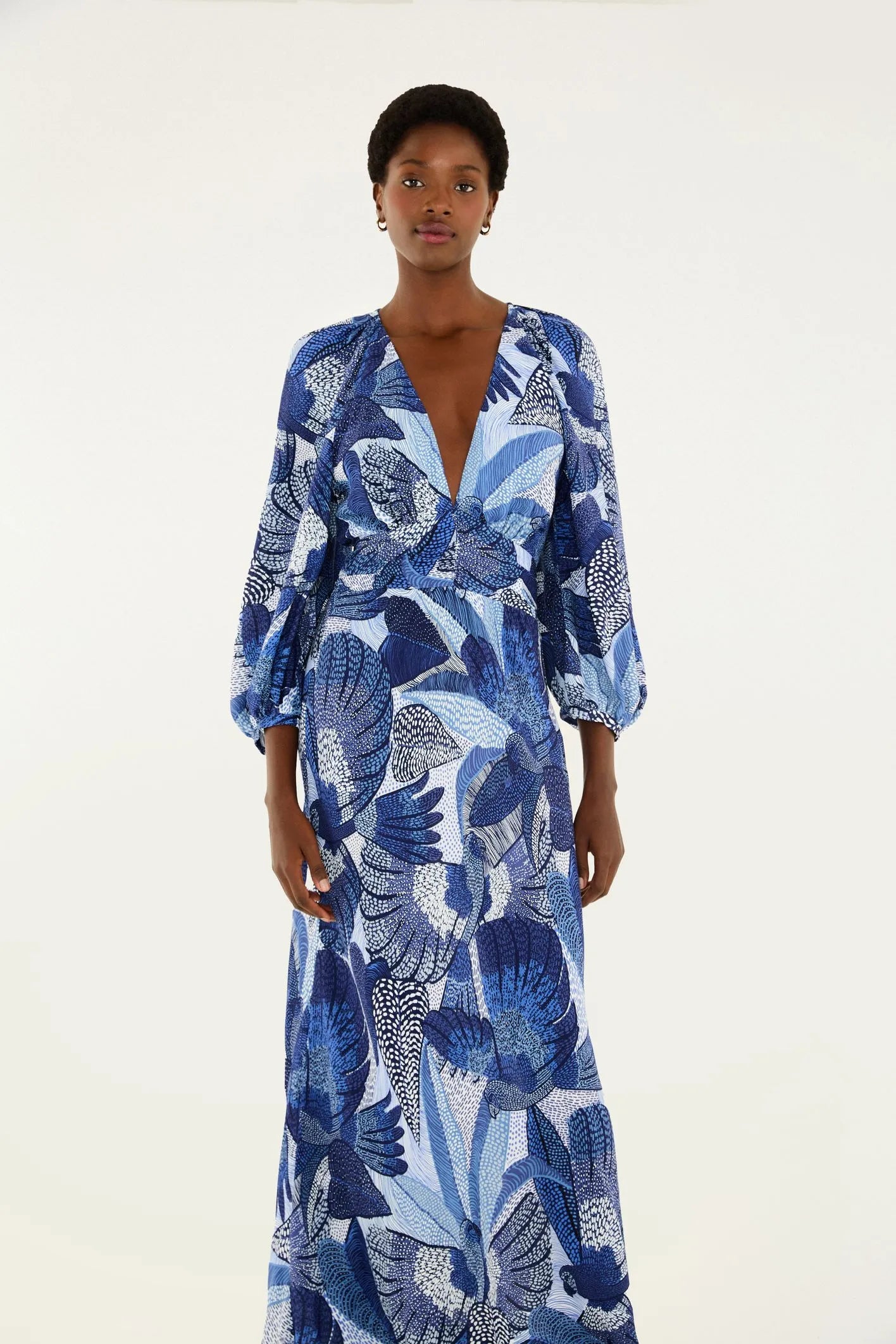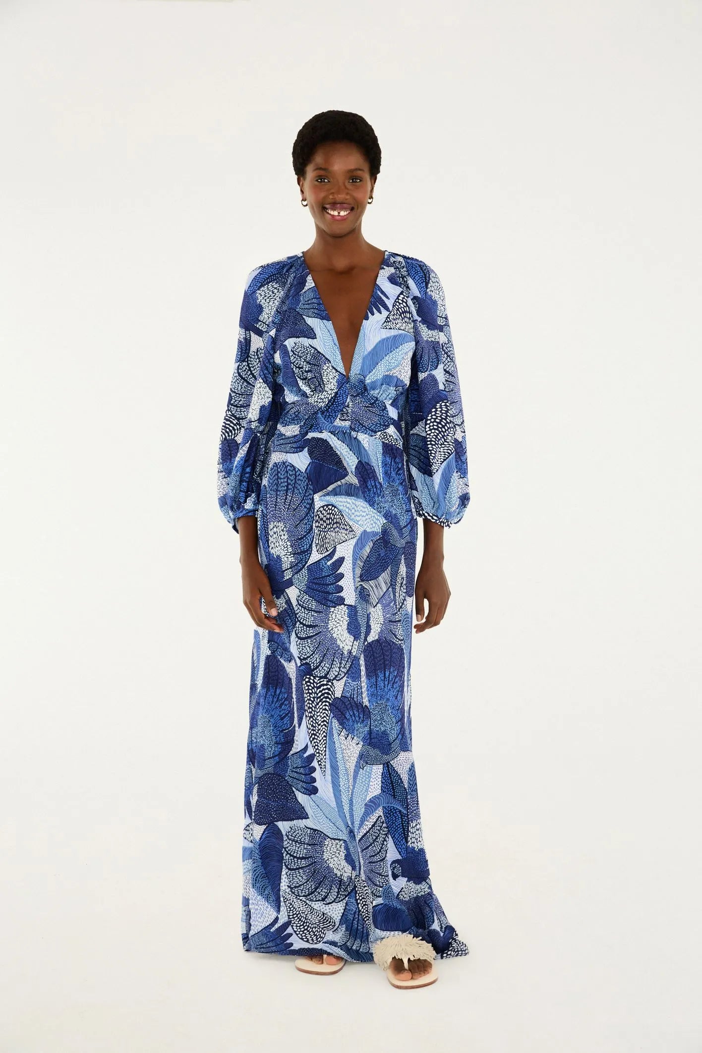 Vestido largo con mangas abullonadas. Presenta un escote en V pronunciado que le da un toque discreto y discreto, y mangas largas abullonadas que le dan un toque especial. La cintura está marcada con un elástico suave, lo que proporciona un ajuste fluido y cómodo. Ideal para eventos formales o informales.
