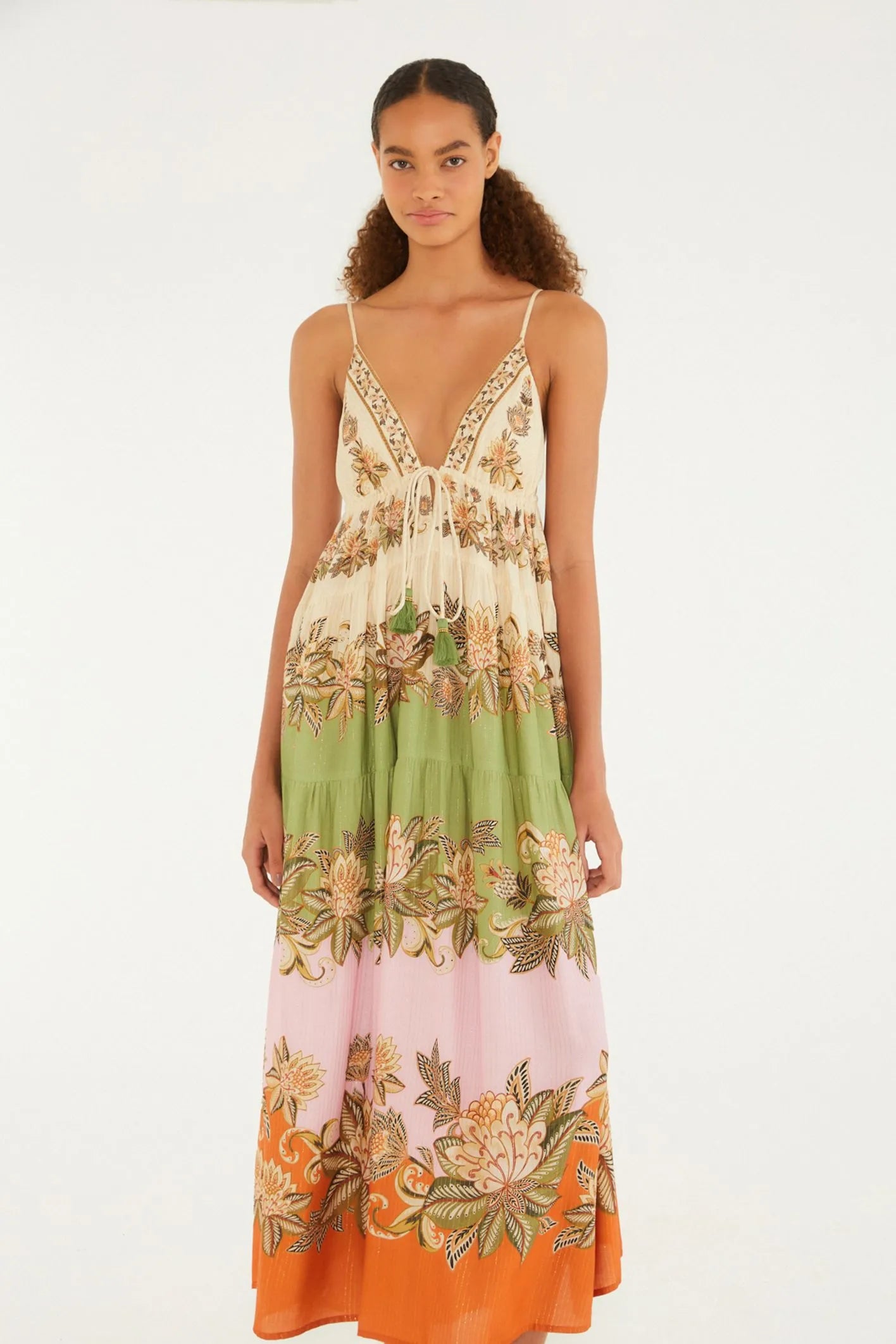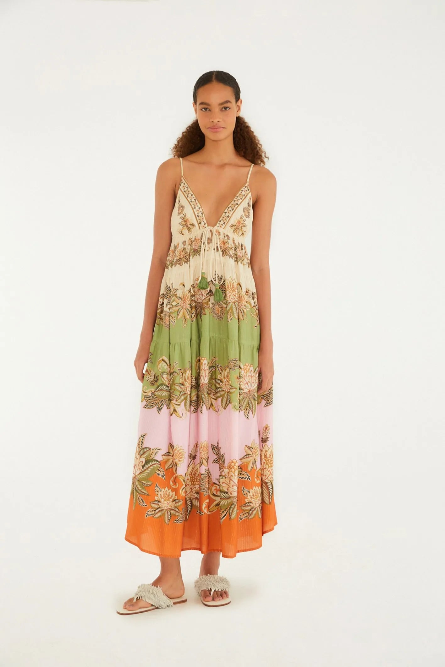 Vestido largo con estampado floral Delhi. Presenta un escote en V pronunciado y tirantes finos que realzan los hombros, creando un look ligero y fluido. La cintura se ajusta suavemente y el tejido fluido proporciona movimiento a cada paso. Perfecto para ocasiones al aire libre o reuniones informales.
