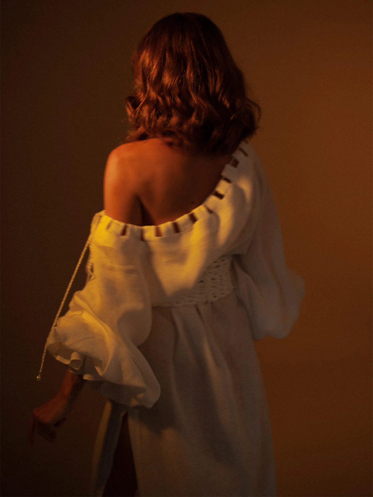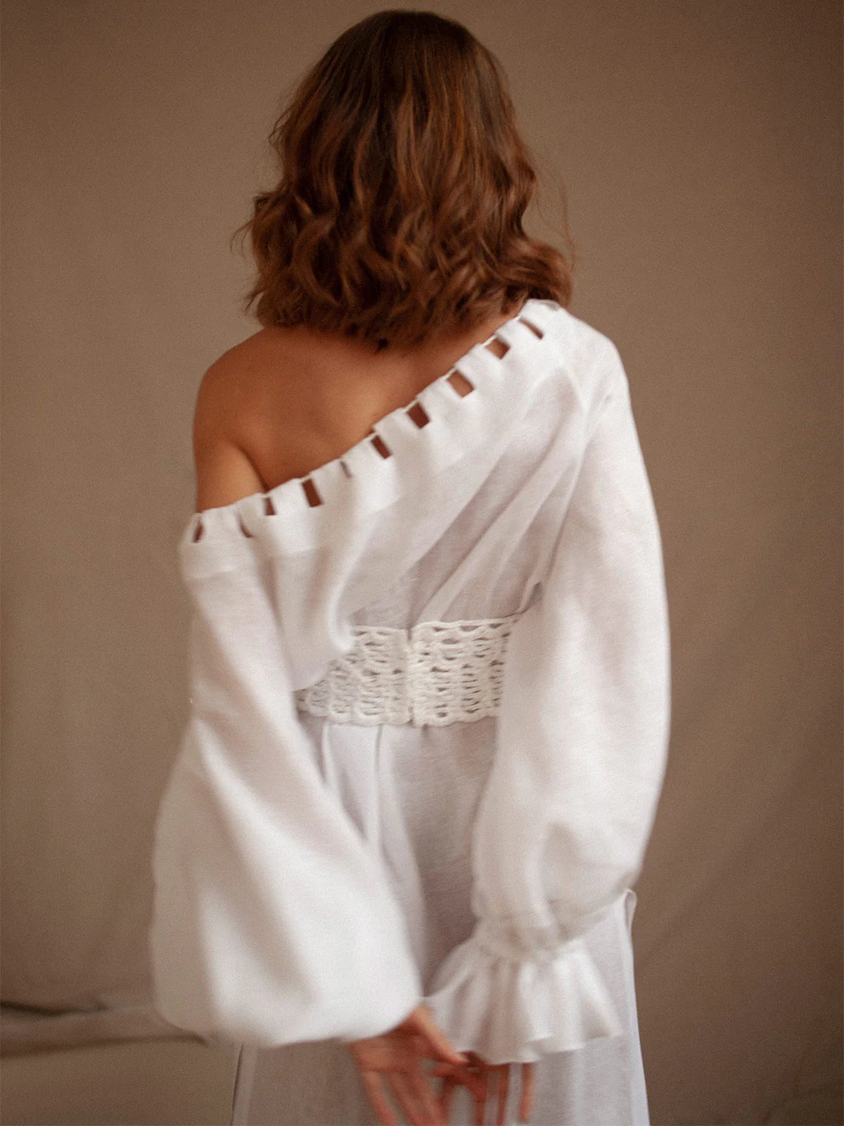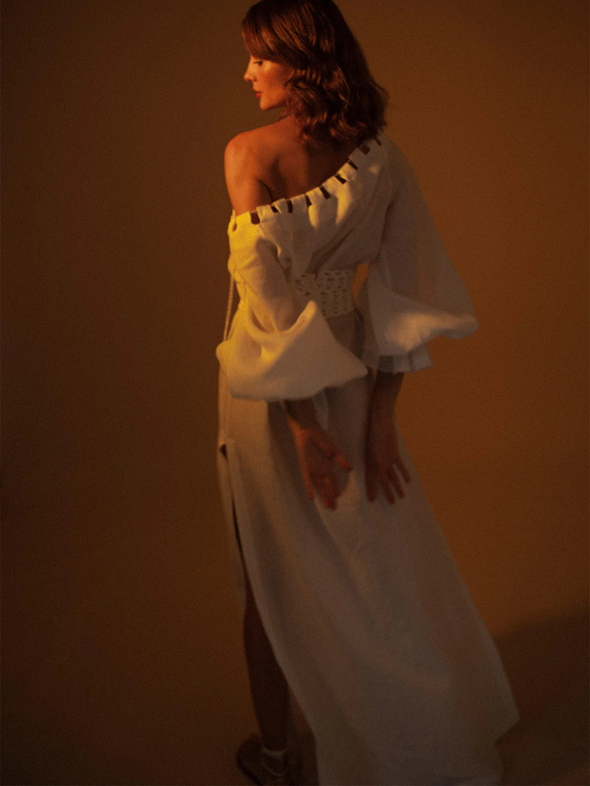 Vestido largo en 100% lino con cuello "off-shoulder" y manga larga.