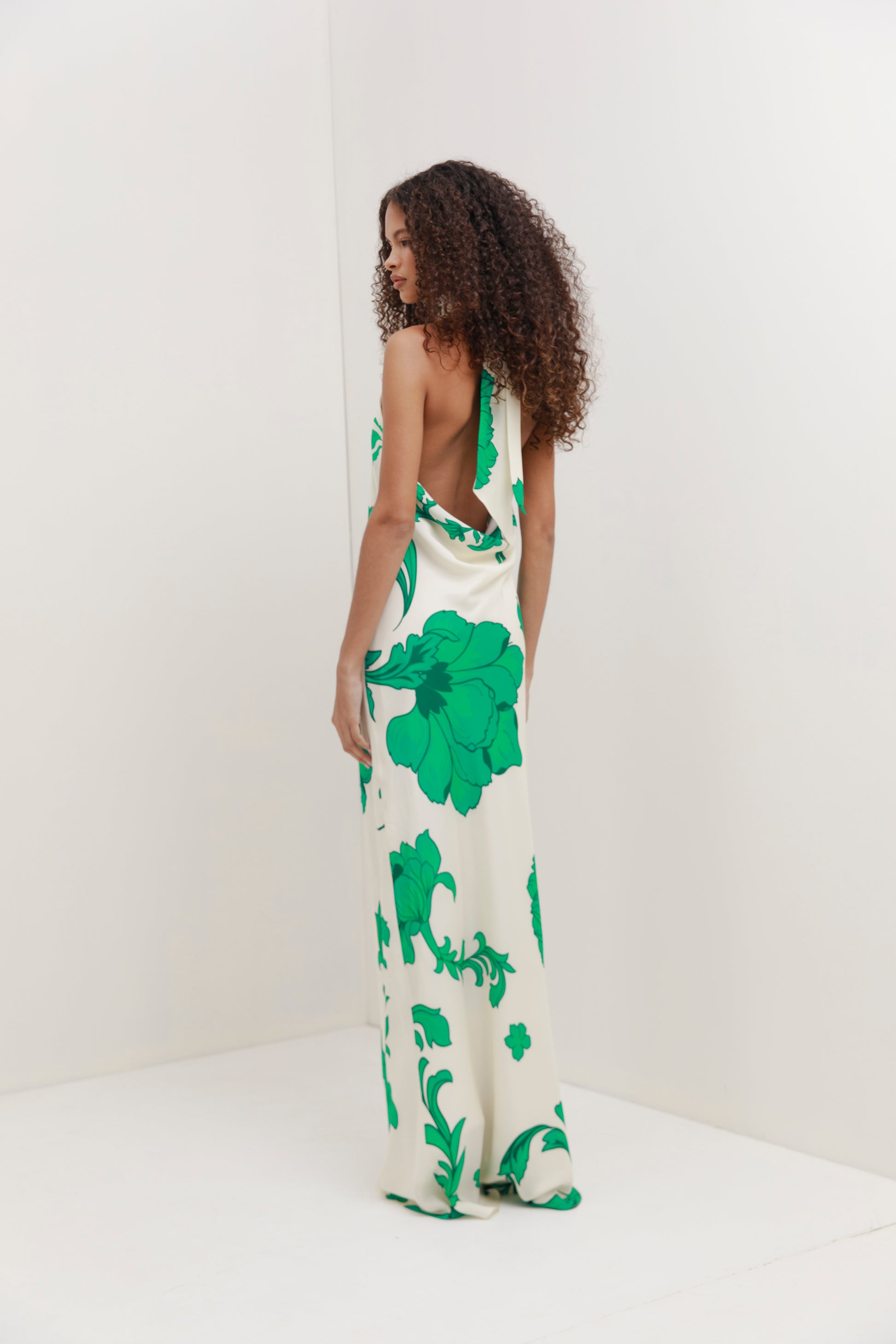 Vestido largo y elegante, de corte maxi, con una silueta ligeramente entallada que cae suavemente al cuerpo, sobre el cual destaca un llamativo estampado floral de gran tamaño en tonos de verde intenso. El diseño floral es audaz y artístico.