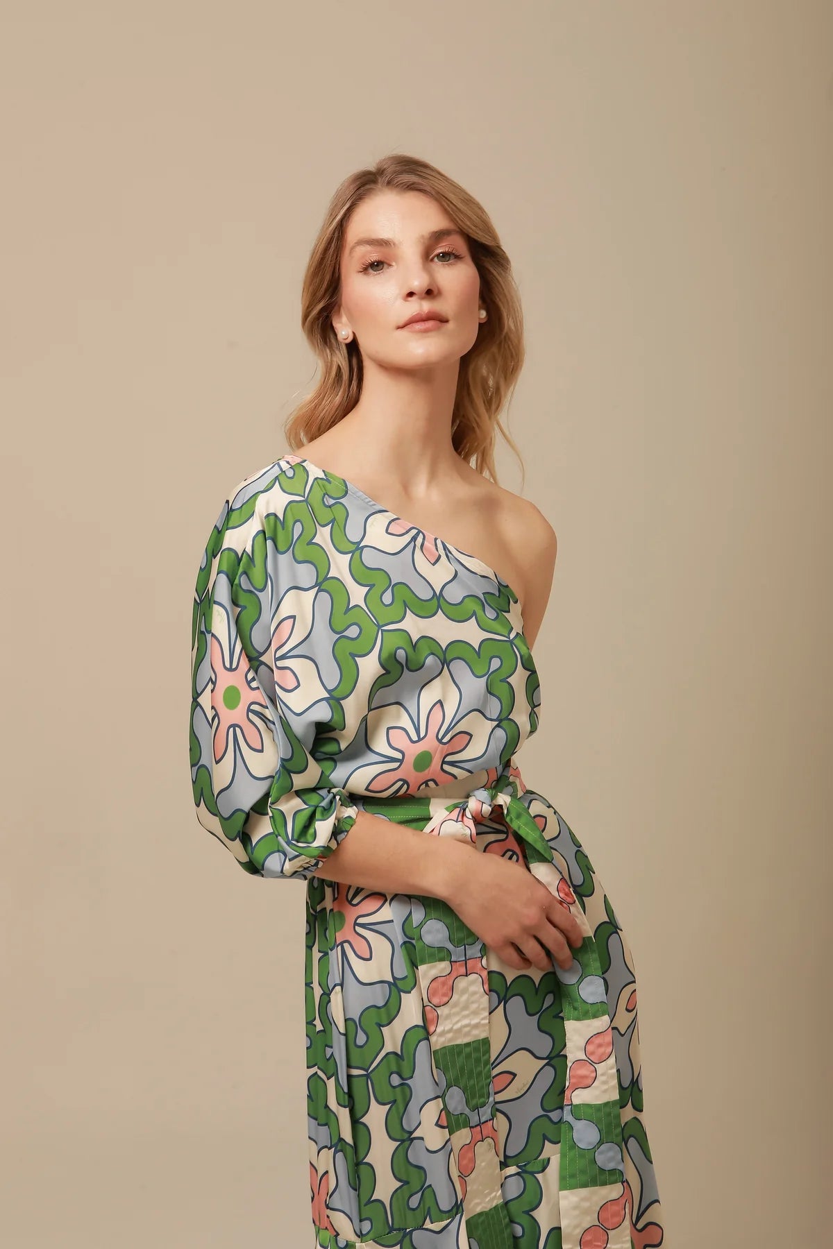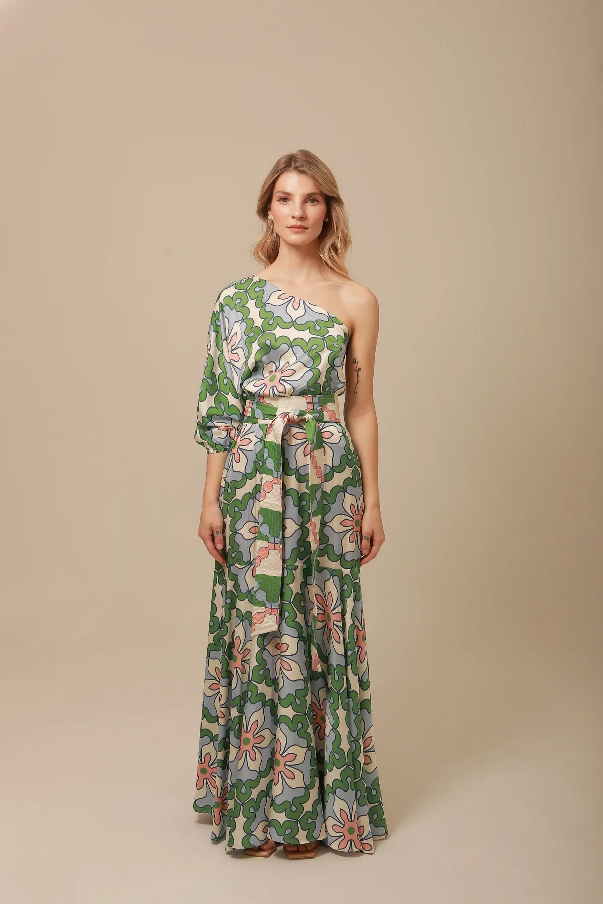 Vestido largo. Manga de un solo hombro. Cintura ajustable.