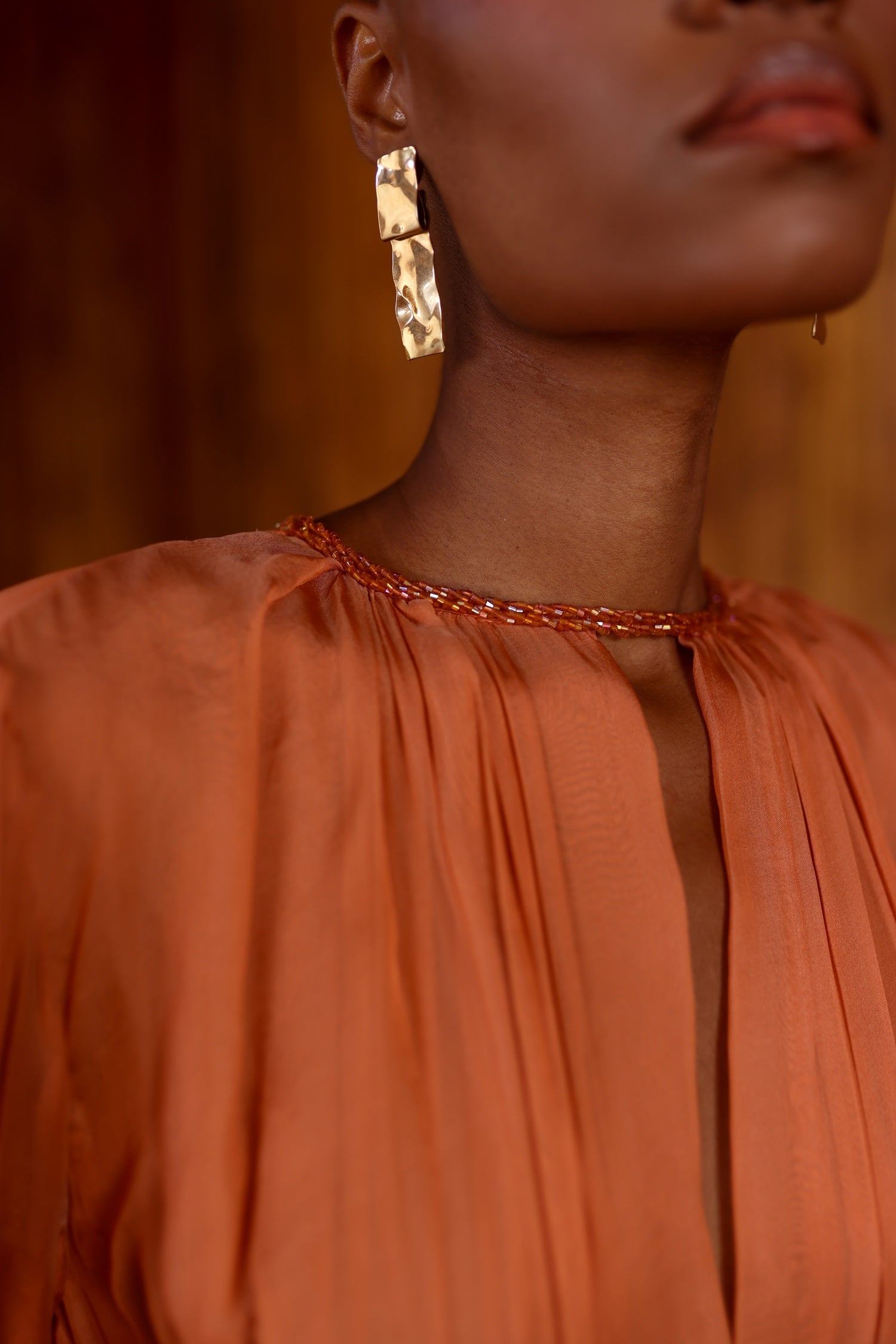 El vestido Julia , confeccionado en delicada gasa, irradia absoluta elegancia y ligereza. Su falda fluida ofrece comodidad y movimiento, mientras que la parte superior cae con gracia, presentando un escote refinado adornado con delicadas cuentas de corneta.