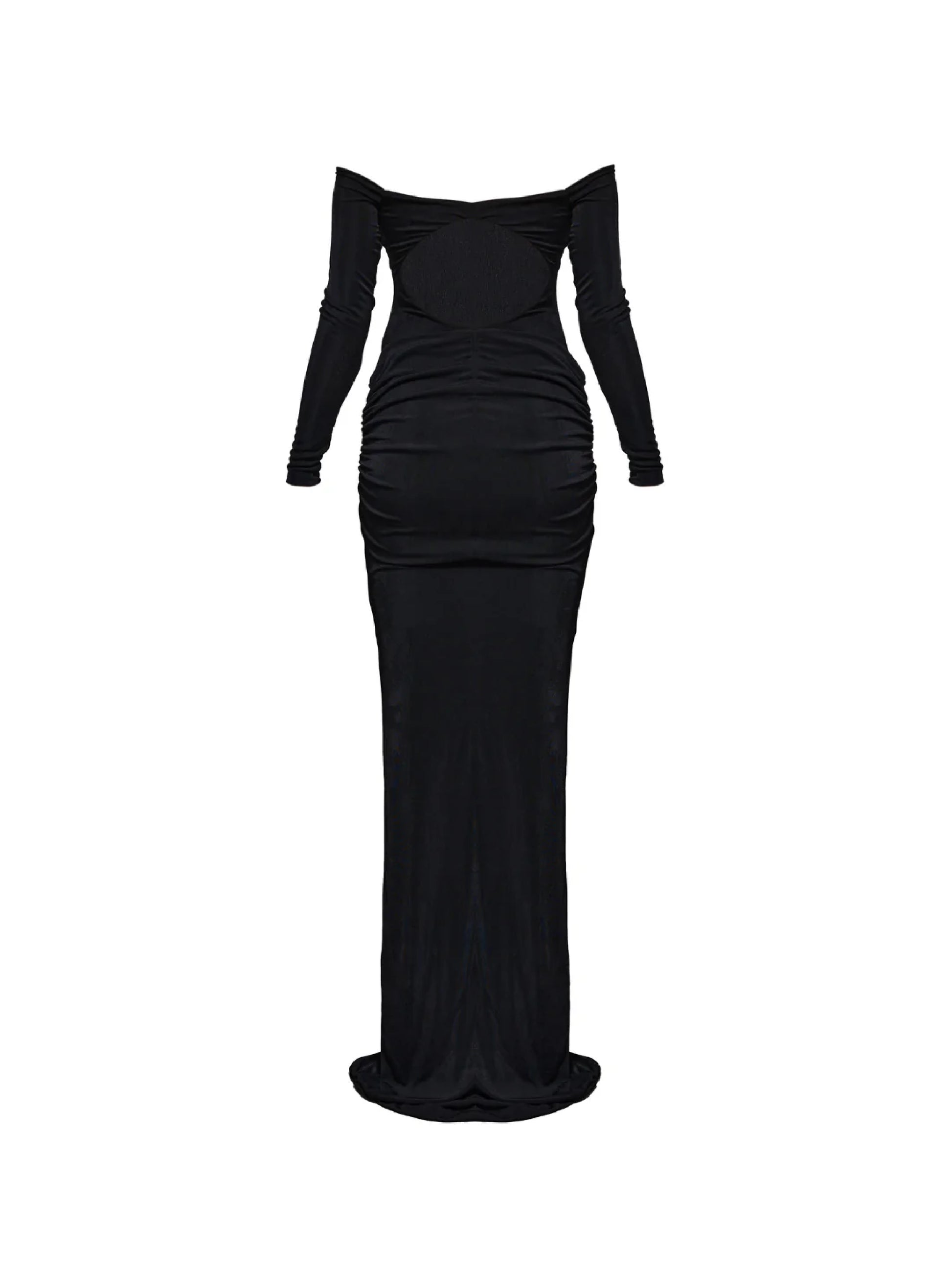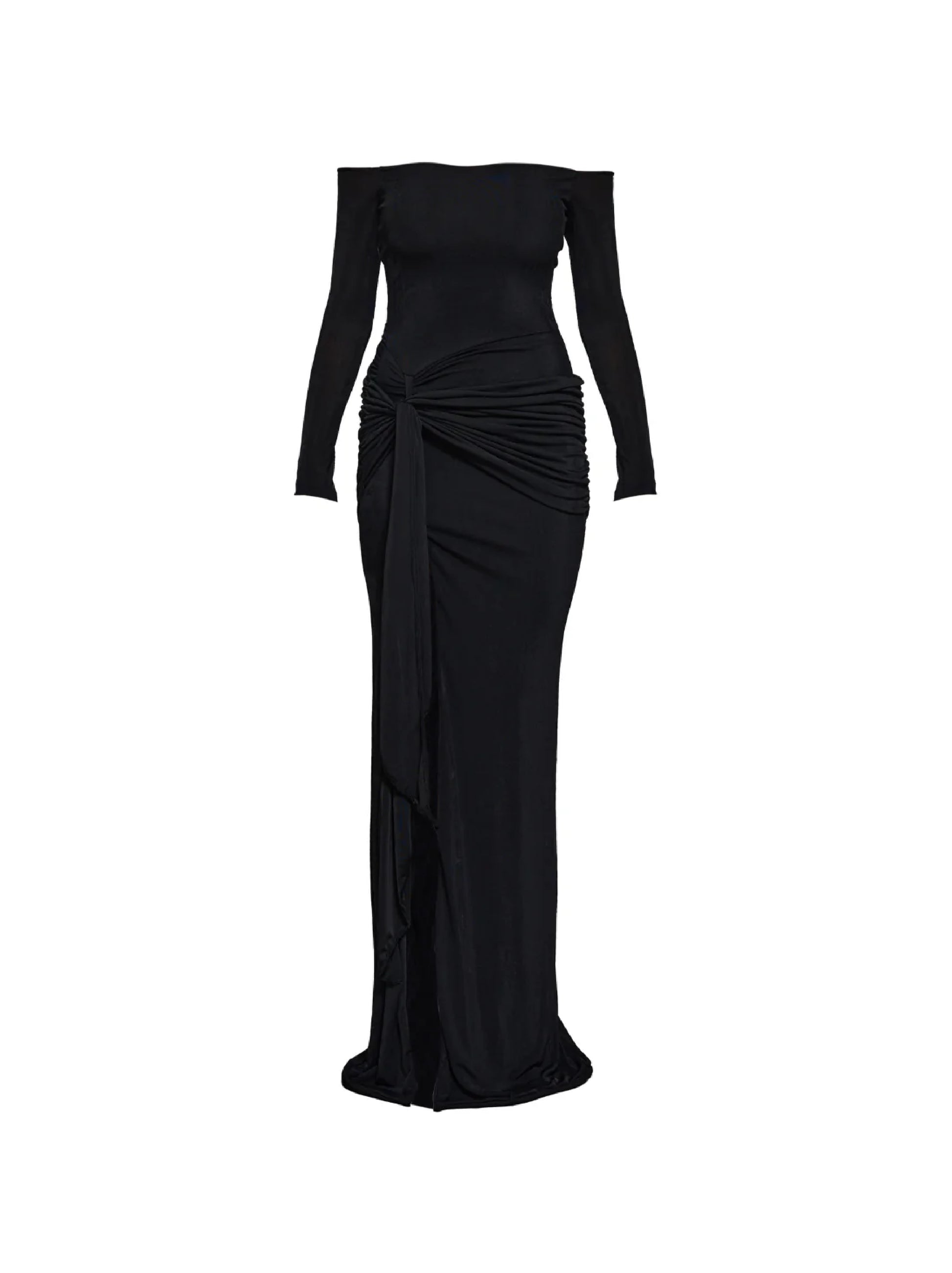 Este elegante vestido en tono negro está confeccionado con una mezcla de 93% poliéster y 7% spandex, lo que le otorga una textura suave y una caída impecable, adaptándose con gracia a las curvas del cuerpo. Su diseño se distingue por una refinada abertura en la pierna, que aporta un toque de sensualidad discreta, mientras que el delicado detalle en la cadera añade un toque de sofisticación. El cuello bandeja, sutil y moderno, resalta la elegancia del escote en la espalda, que completa la prenda con un aire de distinción y estilo atemporal. Ideal para ocasiones especiales, este vestido fusiona comodidad y glamour en una pieza única que no pasará desapercibida.