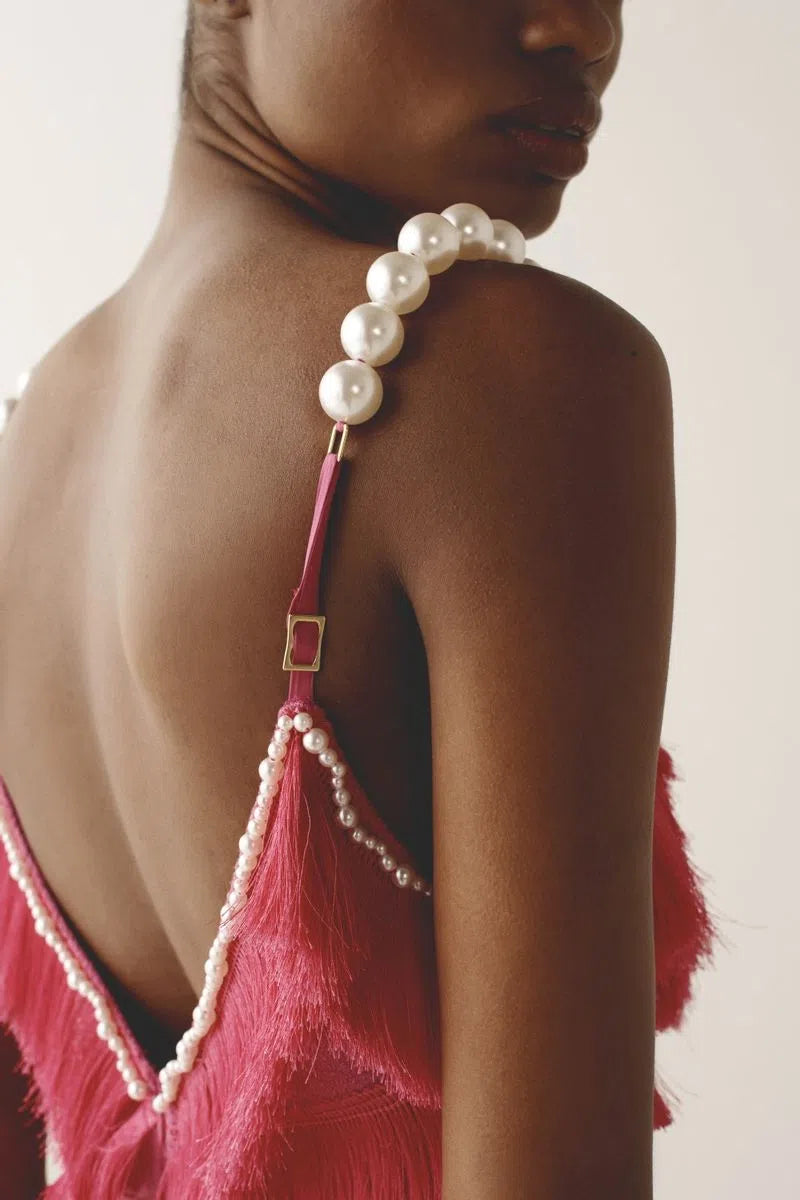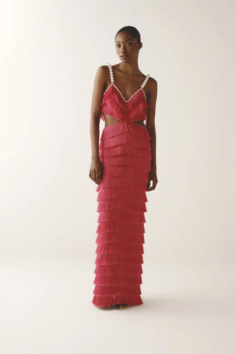 Vestido largo con flecos, detalles en perlas, tirantes finos y ajustables, aberturas en los laterales, abertura en el bajo trasero, cremallera invisible en el centro de la espalda y forro interior.