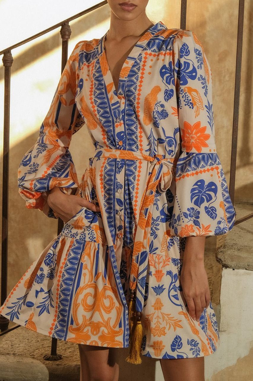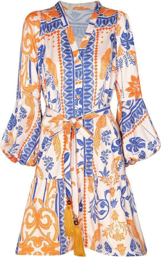 Corte entallado, cuello de pico, mangas largas, puños de campana, botones delanteros, cintura anudada, falda escalonada, mini dobladillo. Composición Popelín 100% algodón.