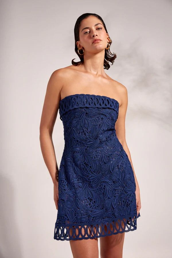 Un minivestido de encaje de guipur sin tirantes con líneas limpias y suaves detalles femeninos.