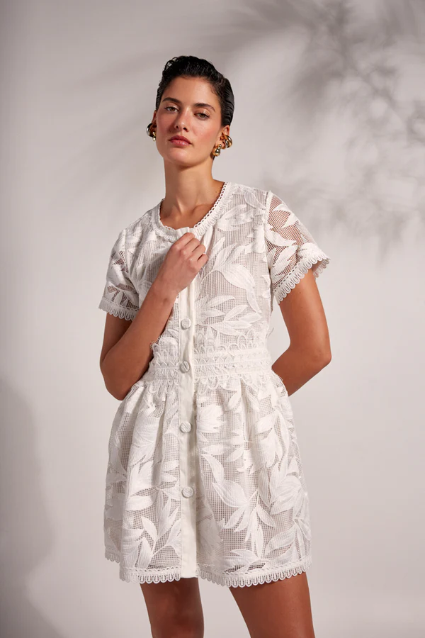 Un minivestido de encaje femenino hecho de tela bordada con un sutil motivo de hojas, diseñado para un look refinado sin esfuerzo