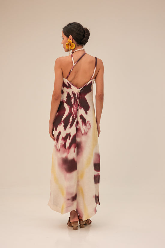 Hecho en lino 100% y bañado en una mezcla espectacular de tonos burgundy, rosa blush y amarillo suave, tiene un fit relajado pero favorecedor.