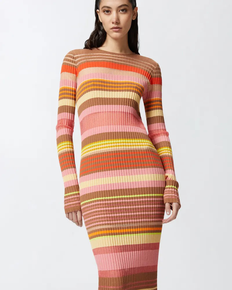 Vestido largo ajustado en punto de algodón, lino y tejido técnico, con ribete vertical y estampado de rayas horizontales multicolor. Perfecto gracias a su original sencillez, este vestido presenta cuello redondo y mangas largas, y se puede personalizar fácilmente con un cinturón para realzar la figura y experimentar con diferentes estilos. Cómodo, práctico y femenino, este vestido largo a rayas se puede llevar con zapatos de tacón sin cordones para un toque extra de feminidad.