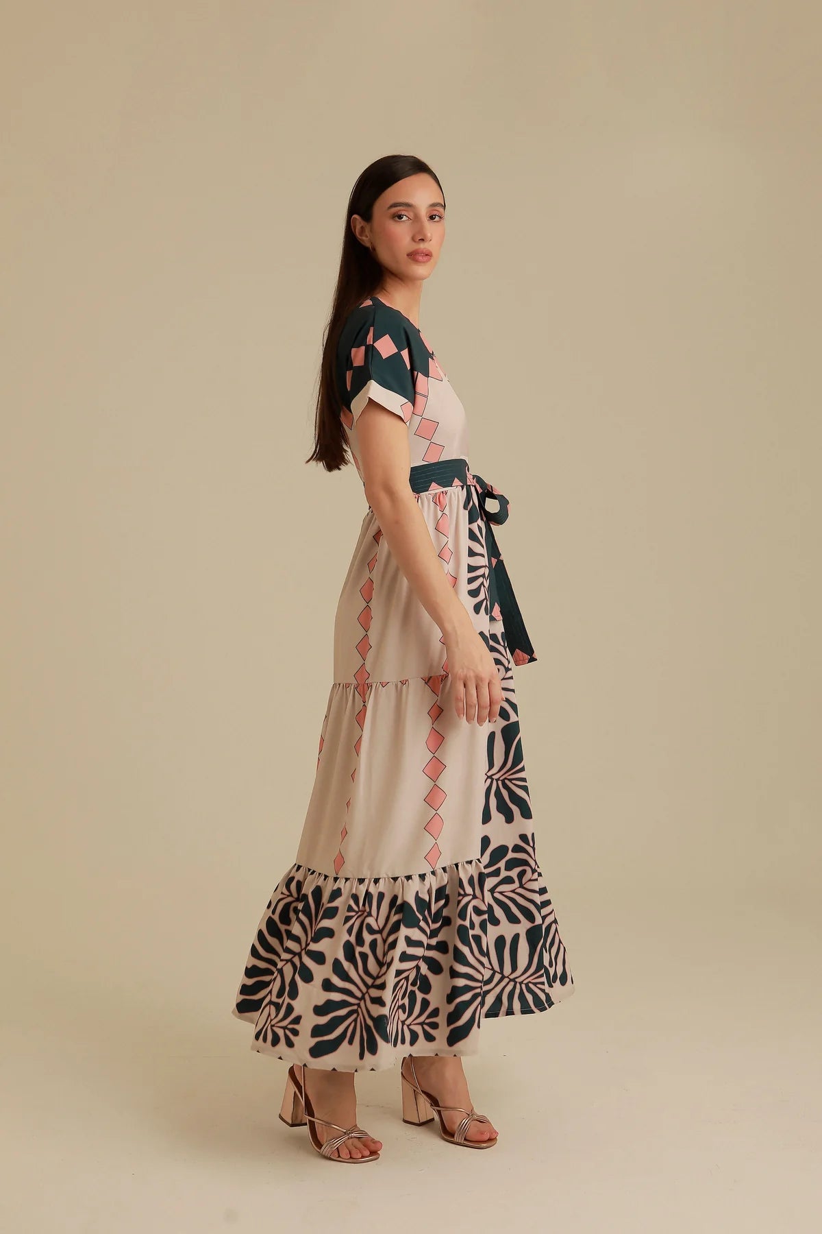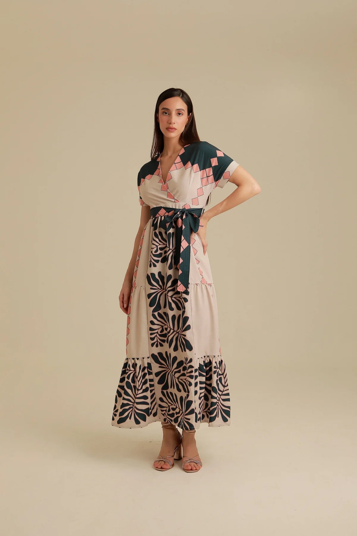Una pieza encantadora que celebra el arte del diseño con frescura y distinción. El Season Dress combina un escote cruzado con mangas ligeras y un lazo que acentúa la cintura, realzando la silueta con naturalidad. Su estampado botánico en contraste con patrones geométricos crea una armonía visual única, perfecta para días soleados o noches especiales. Un vestido que habla de estilo, feminidad y carácter.