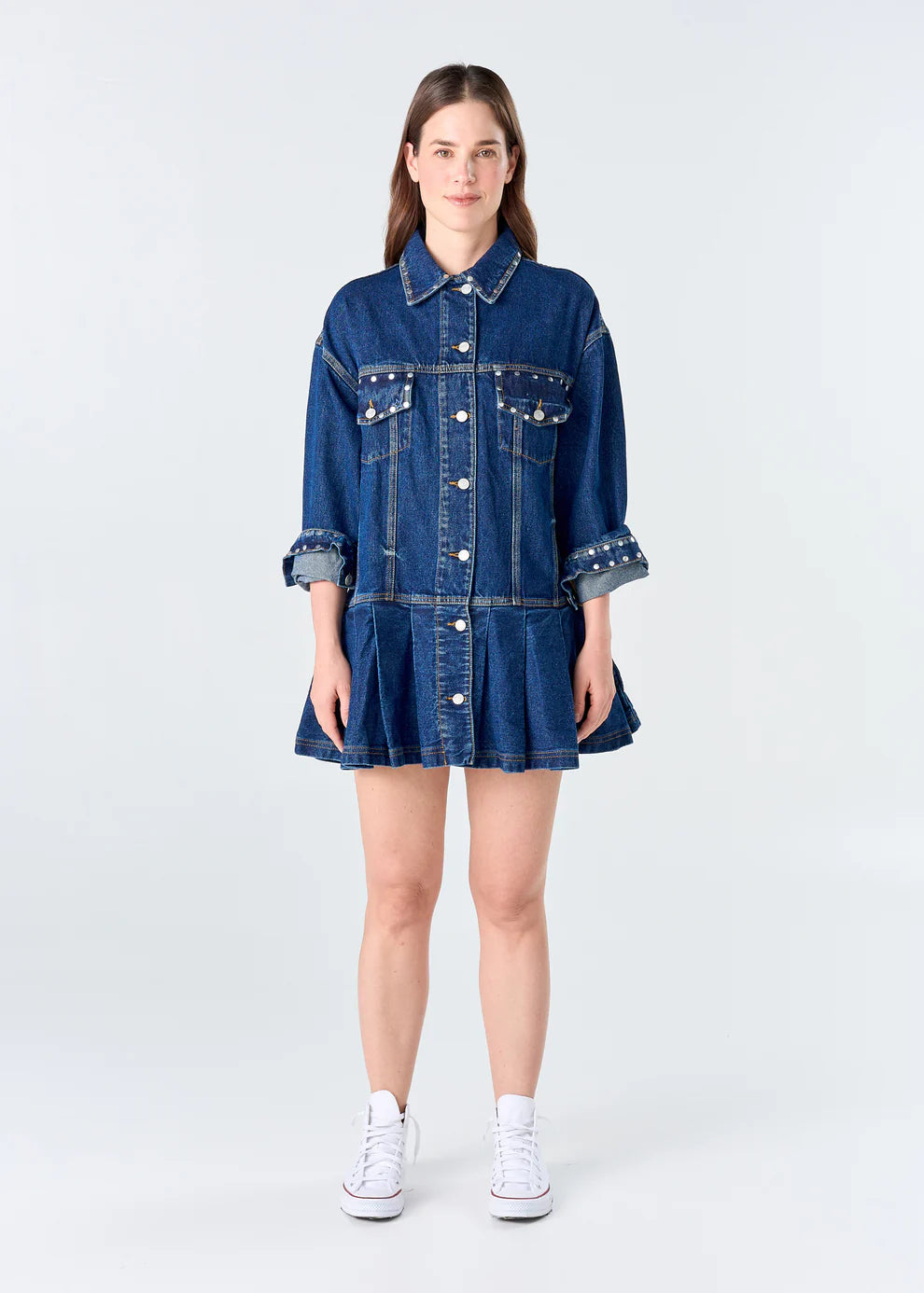 Vestido corto confeccionado totalmente en tela de mezclilla (denim), con un diseño que combina una parte superior tipo chaqueta con una falda plisada.